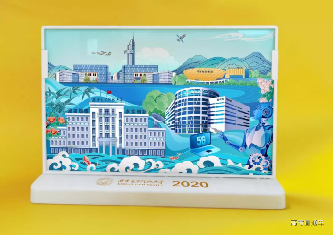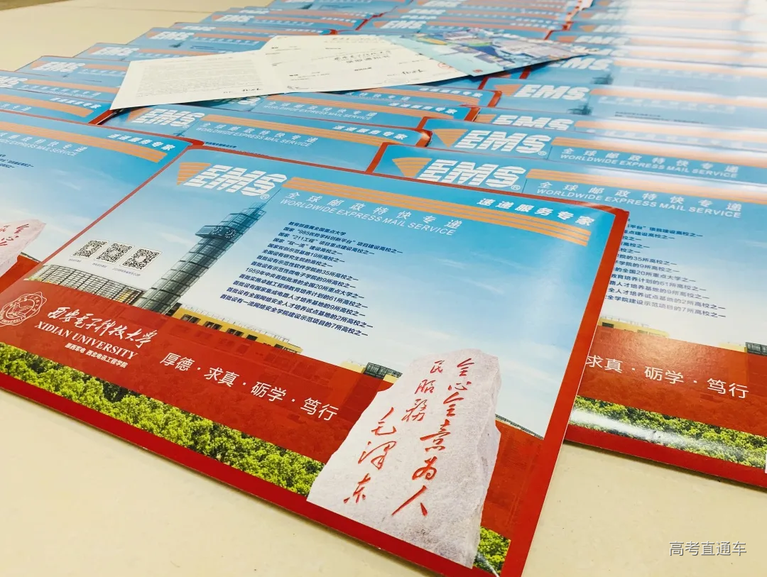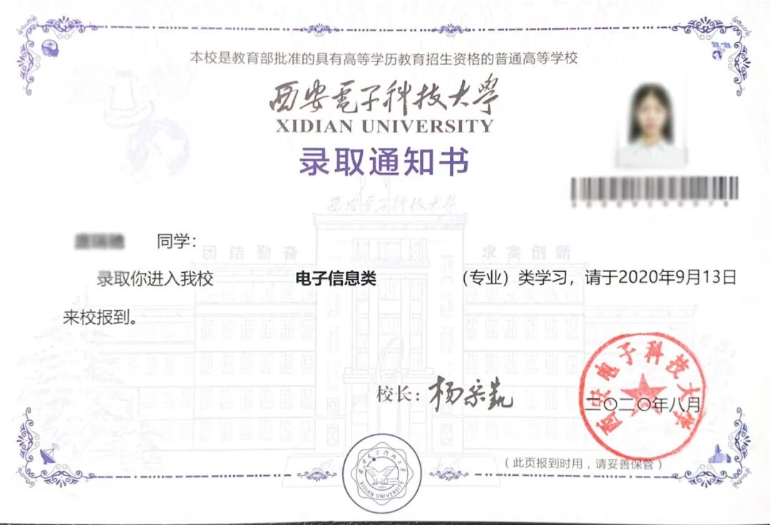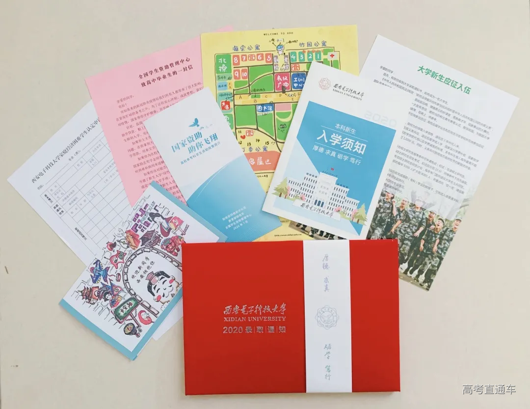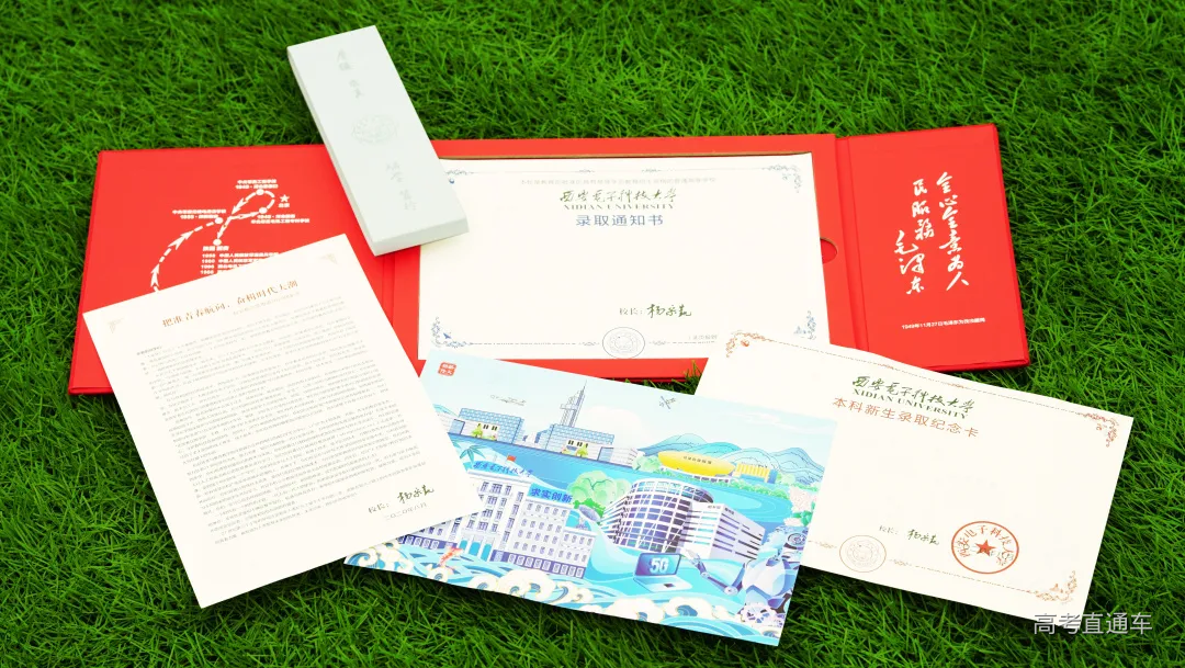 长安人间月,渭水浪千叠 岁月如诗贴,青春是无邪 亲爱的学子 2020年西电录取通知书如约而至 请君查收 ▲2020西安电子科技大学录取通知书 你的录取通知书 硬核手绘立体西电印象卡 给力录取通知书 亲切校长祝福寄语 专属新生纪念卡 ... 你的西电录取通知书 远不止于这些! ▲西电学子为2020录取通知书代言 西电录取通知书由绸布封套和装入其中的手绘立体西电”薪火相传“纪念卡、录取通知书正文页、本科新生录取纪念卡、校长寄语组成,在颜色上延续了以往采用的“西电红”,典雅端庄而富历史传承感,具有极大的收藏意义。 手绘立体西电“薪火相传”纪念卡 终南山下,笔转锋回间刻画印象西电 南校北校,浓墨重彩里贯穿楼宇磅礴 各学科logo,不惜笔墨展现办学特色 丁香海棠竹园,一颦一蹙,刻画西电生活 鱼跃龙门,栩栩如生,寄期学子成才报国 ▼ 自己搭配相框 还可作为书桌陈列装饰摆台 给自己和家人多一份美好纪念! 录取通知书正文主页 录取通知书正文页则采用了冷静、严谨的“西电蓝”为主体色彩,西电主楼贯穿整体的设计表现,通讯卫星、雷达、人工智能等设计元素融入其中,以无线电通讯技术中具有代表性的摩斯电码作为花边的装饰元素,无不彰显着我校在通信领域取得的成绩和鲜明的电子信息特色。 ▲以电子信息类被录取考生为例 本科新生录取纪念卡 今年,我们仍为新生们准备了“本科新生录取纪念卡”,以西电标准红色释放的热情、拼搏进取精神作为入学纪念卡的主色,铭记西电红色基因。 校长寄语 杨宗凯校长随录取通知书附信一封,回忆西电荣光往事、细数西电今朝锐举、展望西电百年未来,寄语2020级新生“把准青春航向,奋楫时代大潮”。 初入西电 首先,祝贺同学们以优异的成绩来到西电 在这里, 你们即将步入恢弘的大学殿堂 翻开人生新的篇章 西电北校区主楼 是西安高校中最具代表性的苏式建筑 她既承载学校历史和记忆 也是所有西电人心目中精神家园的共同寄托 ▲西安电子科技大学北校区主楼 “全心全意为人民服务”主雕塑 1949年毛主席亲笔题词 石碑屹立,精神传承 厚德、求真、砺学、笃行 2020年西电人初心不改 立德树人、血脉延续 ▲西安电子科技大学南校区 西电图书馆 集万千知识与技术革新于一体 在这里,你能智慧阅读,感知科技 在这里,你将徜徉书海,穿越古今 ▲西安电子科技大学南校区图书馆 西电观光塔 现代与科技紧紧相拥 直指云霄,赫然矗立 数时光流沙,身临西电成长 与时钟比肩,俯瞰变幻风云 在这里,校园全景都尽收眼底 ▲西安电子科技大学南校区观光塔 西电远望谷体育馆 在这里 你们将挥洒汗水 奋力奔跑,绽放青春 ▲西安电子科技大学南校区远望谷体育馆 奔你而来的录取通知书 各位准西电er们 你的专属录取通知书 即将奔你而来 我们的工作人员们 正在为大家封装、邮寄录取通知书哦~ ▲等待邮寄的录取通知书们 与录取通知书4份材料一同邮寄的 ⚠️ 小召提醒各位家长和考生: 学校官方邮寄仅此一次,并无其他物品需要签收! 录取通知书发放动态 (截止8月18日09:00) 我们在西电等你来! 2020这一年注定是一个不平凡的一年 在新冠疫情的挑战下 各位准西电人 也闯过了一个不平凡的高考时光 经此一役,方知韶华不负 别来无恙,更念只争朝夕 愿西电, 是你们的可贵如常 愿你们在西电, 芳华永驻,青春无悔 9月,我们在西电等你来!