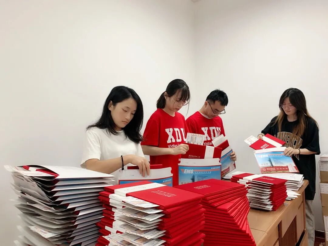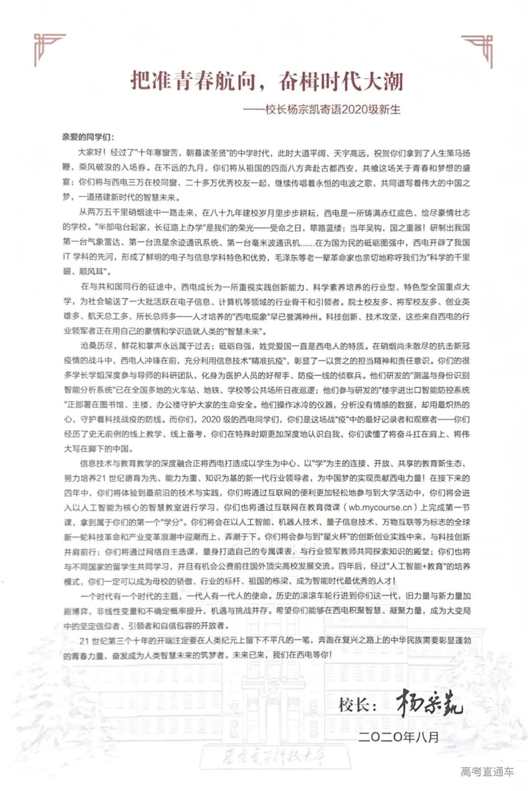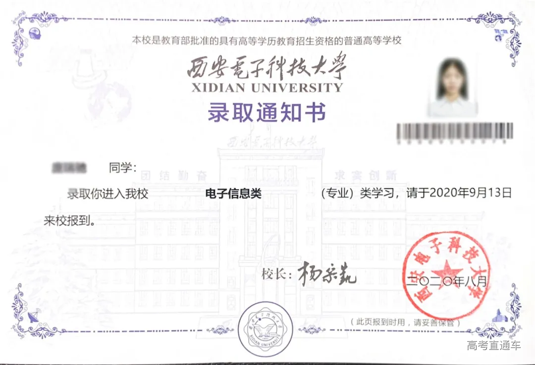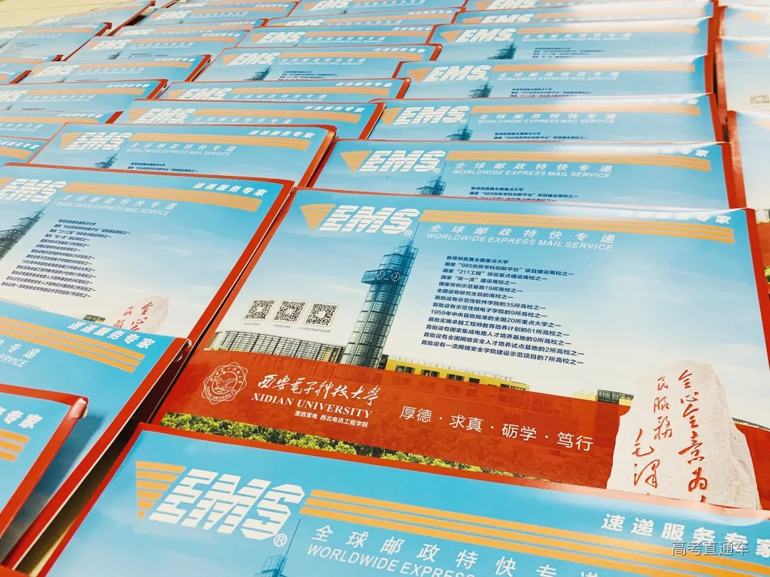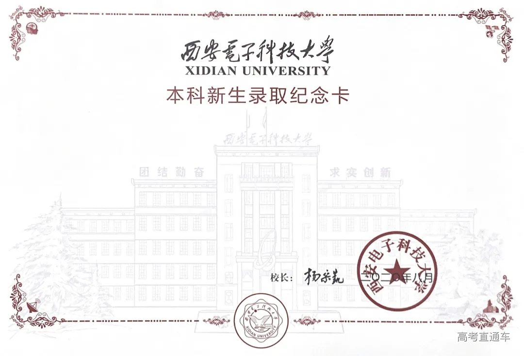 长安人间月,渭水浪千叠 岁月如诗贴,青春是无邪 亲爱的学子 2020年西电录取通知书如约而至 请君查收 ▲2020西安电子科技大学录取通知书 你的录取通知书 硬核手绘立体西电印象卡 给力录取通知书 亲切校长祝福寄语 专属新生纪念卡 ... 你的西电录取通知书 远不止于这些! ▲西电学子为2020录取通知书代言 西电录取通知书由绸布封套和装入其中的手绘立体西电”薪火相传“纪念卡、录取通知书正文页、本科新生录取纪念卡、校长寄语组成,在颜色上延续了以往采用的“西电红”,典雅端庄而富历史传承感,具有极大的收藏意义。 手绘立体西电“薪火相传”纪念卡 终南山下,笔转锋回间刻画印象西电 南校北校,浓墨重彩里贯穿楼宇磅礴 各学科logo,不惜笔墨展现办学特色 丁香海棠竹园,一颦一蹙,刻画西电生活 鱼跃龙门,栩栩如生,寄期学子成才报国 ▼ 自己搭配相框 还可作为书桌陈列装饰摆台 给自己和家人多一份美好纪念! 录取通知书正文主页 录取通知书正文页则采用了冷静、严谨的“西电蓝”为主体色彩,西电主楼贯穿整体的设计表现,通讯卫星、雷达、人工智能等设计元素融入其中,以无线电通讯技术中具有代表性的摩斯电码作为花边的装饰元素,无不彰显着我校在通信领域取得的成绩和鲜明的电子信息特色。 ▲以电子信息类被录取考生为例 本科新生录取纪念卡 今年,我们仍为新生们准备了“本科新生录取纪念卡”,以西电标准红色释放的热情、拼搏进取精神作为入学纪念卡的主色,铭记西电红色基因。 校长寄语 杨宗凯校长随录取通知书附信一封,回忆西电荣光往事、细数西电今朝锐举、展望西电百年未来,寄语2020级新生“把准青春航向,奋楫时代大潮”。 初入西电 首先,祝贺同学们以优异的成绩来到西电 在这里, 你们即将步入恢弘的大学殿堂 翻开人生新的篇章 西电北校区主楼 是西安高校中最具代表性的苏式建筑 她既承载学校历史和记忆 也是所有西电人心目中精神家园的共同寄托 ▲西安电子科技大学北校区主楼 “全心全意为人民服务”主雕塑 1949年毛主席亲笔题词 石碑屹立,精神传承 厚德、求真、砺学、笃行 2020年西电人初心不改 立德树人、血脉延续 ▲西安电子科技大学南校区 西电图书馆 集万千知识与技术革新于一体 在这里,你能智慧阅读,感知科技 在这里,你将徜徉书海,穿越古今 ▲西安电子科技大学南校区图书馆 西电观光塔 现代与科技紧紧相拥 直指云霄,赫然矗立 数时光流沙,身临西电成长 与时钟比肩,俯瞰变幻风云 在这里,校园全景都尽收眼底 ▲西安电子科技大学南校区观光塔 西电远望谷体育馆 在这里 你们将挥洒汗水 奋力奔跑,绽放青春 ▲西安电子科技大学南校区远望谷体育馆 奔你而来的录取通知书 各位准西电er们 你的专属录取通知书 即将奔你而来 我们的工作人员们 正在为大家封装、邮寄录取通知书哦~ ▲等待邮寄的录取通知书们 与录取通知书4份材料一同邮寄的 ⚠️ 小召提醒各位家长和考生: 学校官方邮寄仅此一次,并无其他物品需要签收! 录取通知书发放动态 (截止8月18日09:00) 我们在西电等你来! 2020这一年注定是一个不平凡的一年 在新冠疫情的挑战下 各位准西电人 也闯过了一个不平凡的高考时光 经此一役,方知韶华不负 别来无恙,更念只争朝夕 愿西电, 是你们的可贵如常 愿你们在西电, 芳华永驻,青春无悔 9月,我们在西电等你来!