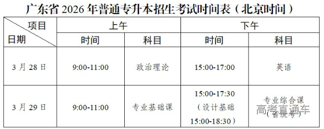 考试科目及时间 2026年普通专升本考试科目共设4门,分别为2门公共课、1门专业基础课、1门专业综合课。公共课、专业基础课每科考试时间120分钟、卷面满分值100分;专业综合课每科考试时间150分钟(设计基础210分钟)、卷面满分值200分。 其中外国语言文学类中非英语类专业公共课为1门,增加1门专业课,专业课考试时间120分钟,卷面满分值100分。 公共课为政治理论和英语2门,其中外国语言文学类中非英语类专业公共课为政治理论1门。 广东省2026年普通专升本 招生考试时间表 备注:外国语言文学类中非英语类专业的专业课,以及院校自行组织命题的专业综合课科目,由招生院校自行组织,考试时间由院校在省招生办规定的时间范围内自行决定并通知考生。