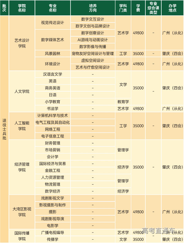 2026年普通专升本拟招生专业 (退役士兵批) 报考条件:无前置专业要求 注:最终招生专业、收费标准等信息以广东省教育考试院核定发布为准