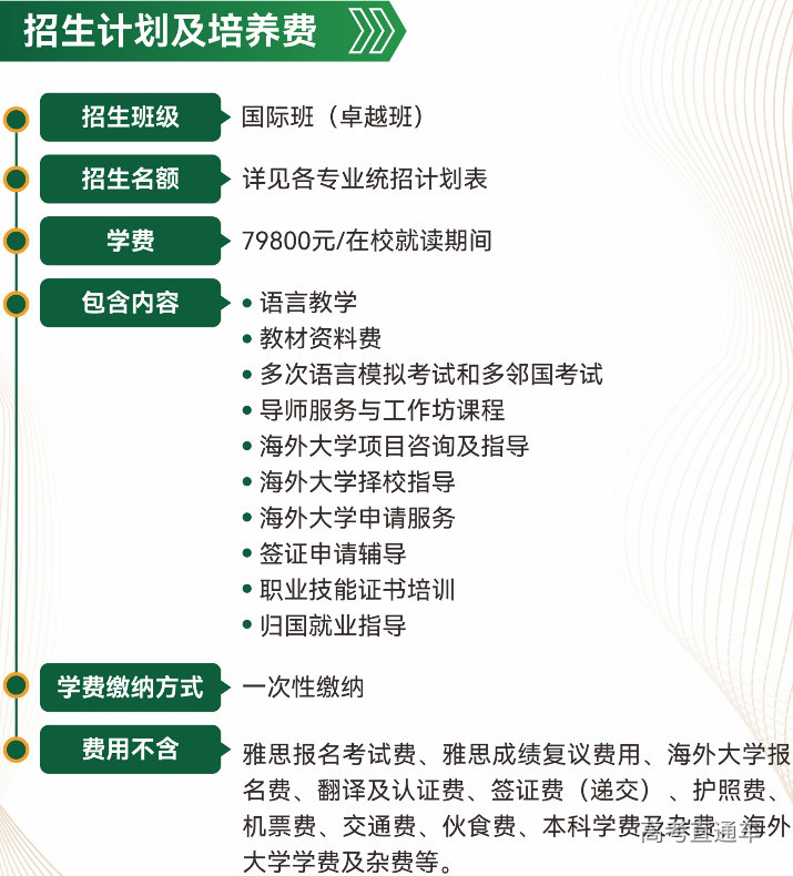 国际班(卓越班)采用"小班制、精英化"教学模式,汇聚国内外知名学者与行业专家,运用双语授课、案例研讨、项目实践等多元教学方法,打造沉浸式国际化学习氛围。学生在本科阶段,既能筑牢学术根基,又可参与各类国际交流项目,积累宝贵的跨文化沟通经验。 凭借与全球百余所顶尖高校的紧密合作,为毕业生铺设多元深造路径。完成本科学习后,学生可自由选择前往美国、英国、加拿大、澳大利亚等热门留学地,或申请中国香港、澳门地区知名学府攻读硕士学位。致力于连接国际优质教育资源,为学生学术深造与职场发展提供坚实助力。