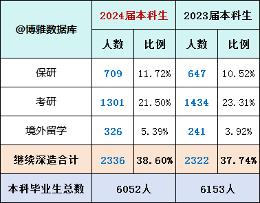 学校 2024届本科毕业生人数6052人,其中免试推荐研究生709人、考研录取 1301人、出国(境)留学 326人,本科生升研率38.60%,实现升学率连续10年增长。