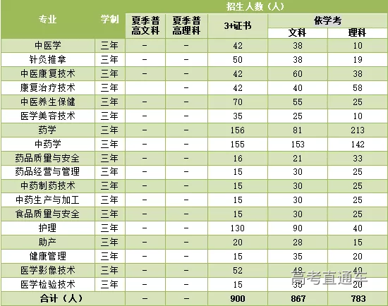 学院根据社会对卫生健康技术人才的需求,开办了中医学、中药学、药学、护理、助产、中医康复技术、康复治疗技术、医学美容技术、针灸推拿、中医养生保健、药品质量与安全、药品经营与管理、中药制药技术、中药生产与加工、食品质量与安全、健康管理、医学影像技术、医学检验技术等18个专业,各专业分类招生计划见下表。 【费用标准】 经物价部门批准,学费6410元/学年;宿舍提供空调、热水等,住宿费950元~1050元/学年。 专业简介 培养目标:培养掌握中医学基本知识、基本理论和专业技能,在基层医疗卫生机构从事中医医疗以及预防保健、康复、养生、健康管理工作的应用型人才。 主修课程:中医基础理论、中医诊断学、中药学、方剂学、针灸学、推拿学、中医内科学、中医外科学、中医妇科学、中医儿科学、内经选读、诊断学基础、内科学等。 职业资格:助理执业中医师、保健调理师。 就业方向:各级基层医疗卫生机构从事中医临床医疗、预防保健工作;在中医保健机构从事推拿、保健按摩、康复、养生、健康管理工作。 培养目标:培养德智体全面发展,掌握中医坚实的基本理论和系统深入的专业技能,在基层医疗卫生机构从事中医医疗以及针灸推拿、康复保健工作的中医适宜技术应用型人才。 主修课程:中医基础理论、中医诊断学、经络腧穴学、刺法灸法学、针灸治疗学、推拿手法功法学、推拿治疗学、中医内科学、中医外科学、小儿推拿技术、诊断学基础、内科学等。 职业资格:助理执业中医师、保健按摩师。 就业方向:各级基层医疗卫生机构从事中医临床医疗、预防保健工作;在中医保健机构从事针灸推拿、保健按摩工作。 培养目标:培养掌握中医康复技术基本理论和专业技能,从事传统及现代康复治疗工作、康复指导的高素质应用型人才。 主修课程:针灸推拿技术、中医外治技术、康复评定技术、运动治疗技术、物理因子治疗技术、作业治疗技术、言语治疗技术、康复工程技术、常见疾病康复、中医康复专业技能综合实训等。 职业资格:康复治疗师、保健按摩师、健康管理师等。 就业方向:在各级医院、专科医院、社区卫生服务中心、中医康复保健机构等康复治疗岗位,各种康复保健机构从事中医康复与保健工作。 培养目标:培养掌握临床医学、康复医学的基本理论和基本技能,具备开展常见疾病及多发疾病康复治疗及保健指导能力,能在各级各类康复医疗机构从事康复治疗工作的高级应用型专门人才。 主修课程:人体形态学、人体机能学、人体运动学、康复医学导论、康复评定技术、传统康复技术、运动治疗技术、物理因子治疗技术、作业治疗技术、言语治疗技术、康复工程技术、常见疾病康复、社区康复、临床医学概论、急救技术、运动训练学、康复心理学等。 职业资格:康复治疗技师、保健按摩师。 就业方向:各级综合性医院、康复中心、康复医院、疗养院及福利院康复科从事康复治疗工作。 培养目标:培养掌握中医顺应自然、辨证论治、平衡阴阳等养生理论与技能,具备扎实中医理论基础,能运用中医理论指导养生保健,从事养生保健、康复理疗、指导开展药膳食疗、 健康管理等工作的高素质技术技能型人才。 主修课程:中医基础理论、中医营养学、中医养生保健技术、中医体质辨识技术、中医健康检测技术、中医传统养生功法、针灸养生保健技术、推拿养生保健技术、药膳养生保健技术、中医治未病学基础、中医情志养生技术等。 职业资格:养生保健师、健康管理师、营养师、保健按摩师。 就业方向:基层医院中医科、未病防治中心、各级医疗保健机构、养生机构、社区健康服务中心、健康管理机构等从事中医养生指导、中医体质辩证与调整、药膳养生等工作。 培养目标:培养在各级医疗美容机构、美容化妆品企业、大健康企业等,从事高科技美容美体护理、中医美容、保健养生、美容指导、美容管理、教育培训等工作的高级应用型技术人才。 主修课程:人体解剖生理学、素描、医学美学、美容行业认知、中医学基础、美容用药、彩妆技术、化妆品应用指导、美容仪器应用、经络腧穴、美容营养学、中医养生、科技与美容养生、芳香疗法、市场营销实务、企业特色美容疗法、美容心理学等。 职业资格:高级美容师、高级化妆师。 就业方向:在医疗美容机构、生活美容机构及大健康企业从事高级美容技师、医学疗美容咨询师、美容顾问及美容导师/讲师等工作。 培养目标:培养具备中药鉴定、中药调剂、中药制剂、中药炮制、中药养护、药品营销及仓储保管等方面的基本理论知识和实践操作技能的高素质应用型技术人才。 主修课程:中医学基础、中药学、方剂学、人体解剖与生理学、中药化学、药用植物学、中药鉴定技术、中药炮制技术、中药药剂学、中药制剂检测技术、药事管理与法规、药品营销技术、专业技能综合实训。 职业资格:药物制剂工、中药炮制工、本专业职称资格证及执业中药师。 就业方向:在各级各类医院药剂科、医药公司、制药企业、中药饮片厂、社会药房、药品检验及药品监督机构等部门从事中药质量检验、中药炮制、中药调剂、药品营销及仓储保管、药品质量管理等工作;在保健品、化妆品等领域从事相关专业工作。 培养目标:培养掌握药品生