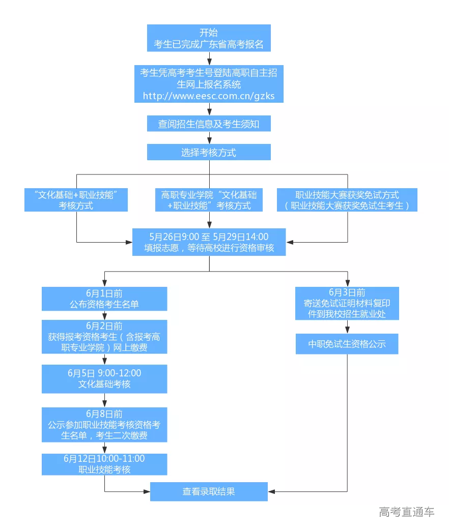获得广东省中等职业学校技能大赛一等奖或全国职业院校技能大赛三等奖及以上奖项的中等职业学校在校生,毕业两年内参加我院自主招生,经我院根据国家和省职业院校技能大赛获奖名单核实资格、考核公示后,可免试录取。申报流程如下: