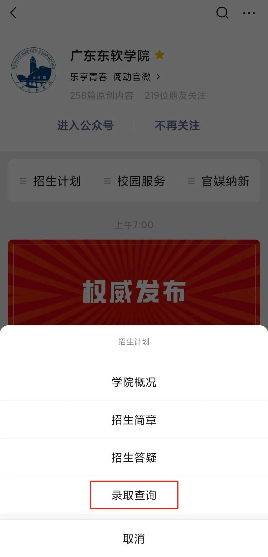 考生关注“广东省教育考试院”微信公众号,在页面底部选择“小程序”栏,点击进入“广东省教育考试院”小程序,通过考生号和密码登录即可查询考生录取结果。广东省教育考试院将通过号码106906708或106905708向已录取考生在高考志愿填报系统绑定的手机号码推送录取结果。广东东软学院招生网(网址:http://zsw.nuit.edu.cn)