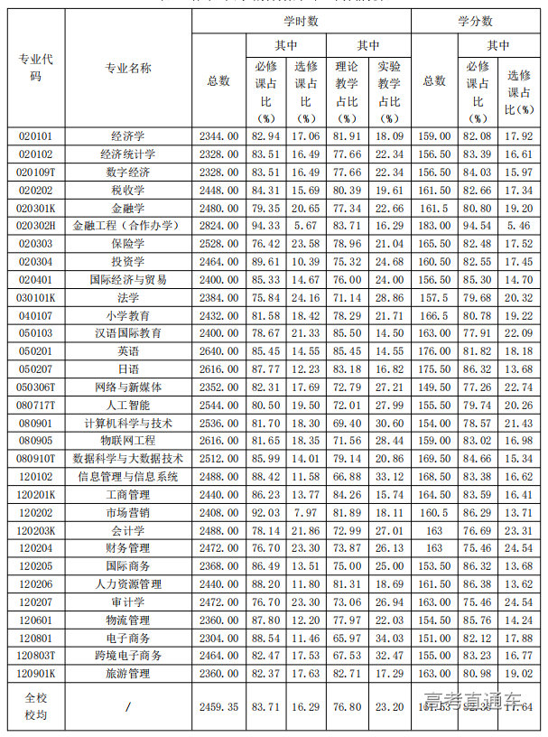 1.注重课程体系建设,重视学生综合素质教育培养。设置文学美育类课程、劳动教育课程,优化课程体系与教学环节,合理分配学分(学时),大力加强学生创新创业教育、实践能力培养和综合素质提升。学校各专业平均开设课程 36.44 门,其中公共课 7.84 门,专业课 28.59 门;各专业平均总学时 2459.35 学时,其中理论教学与实验教学学时分别为 1889.87、569.48 学时(详见表 5)。