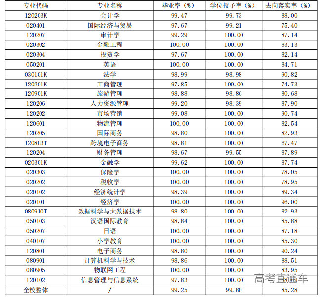 2024 届毕业生共计 3612 人,其中毕业 3568 人、授予学士学位 3561 人;应届生毕业率为 99.25%、学位授予率为 99.80%。2024 届毕业生中共有 86人考取国内高校研究生、11 人赴国外高等学府攻读研究生,整体考研率为2.70%,毕业去向落实率达 85.28%。