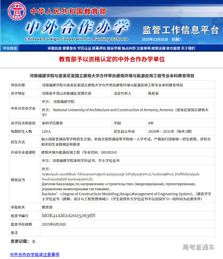近日,教育部公布了2025年下半年中外合作办学项目审批结果,我校与亚美尼亚国立建筑大学合作举办的建筑环境与能源应用工程专业本科教育项目成功获批,标志着我校国际化办学取得新突破。