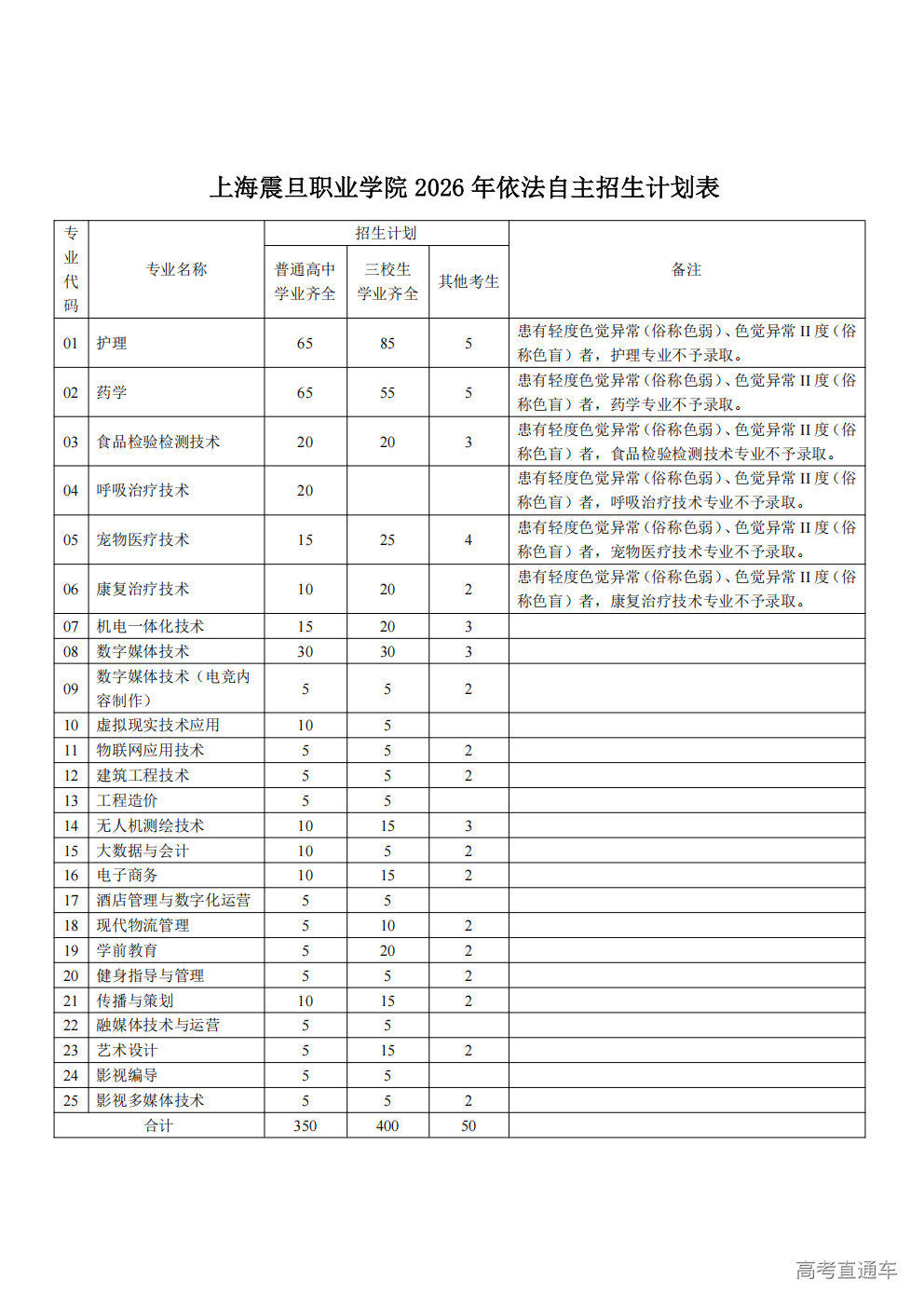 上海震旦职业学院2026年专科层次依法自主招生计划