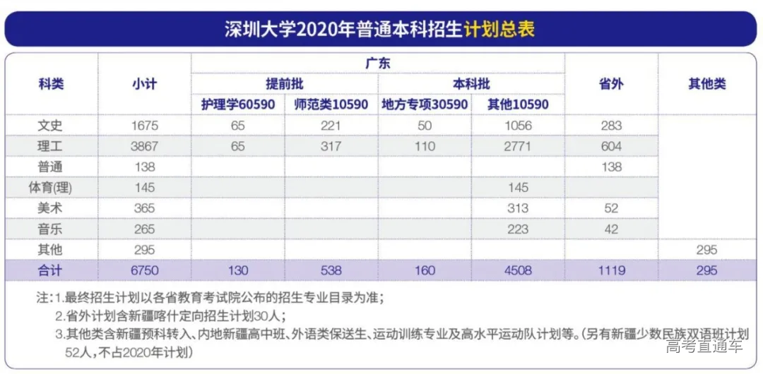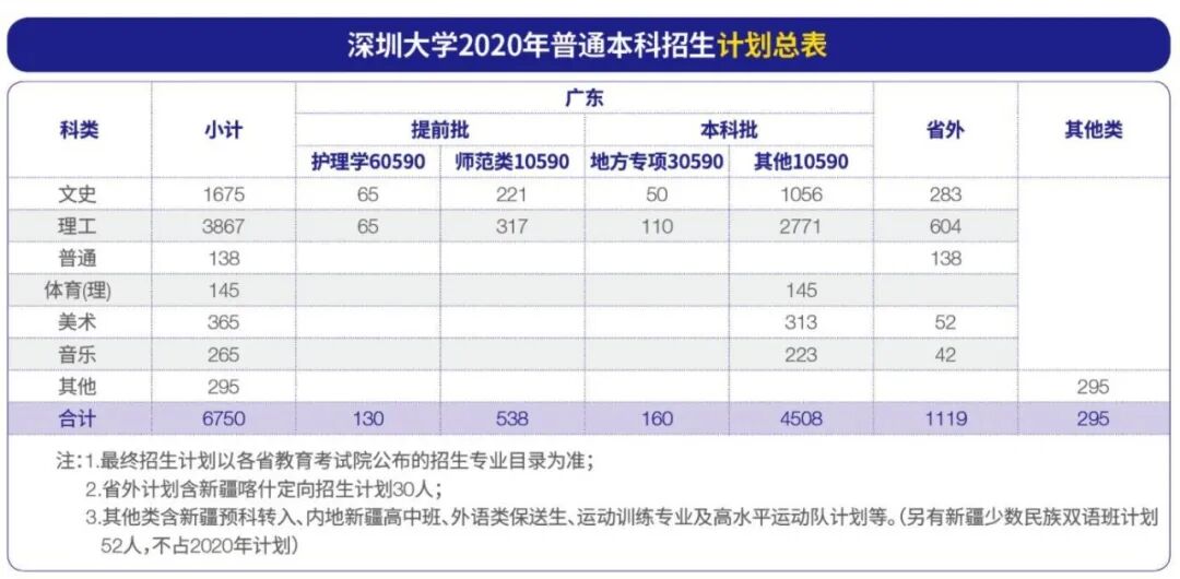 2020年我校本科招生总计划为6750人,其中,广东省招生总计划为5336人 。广东省计划中,提前批为668人(招生代码60590:130人,招生代码10590:538人);本科批中广东贫困专项(招生代码30590)为160人(文史50人,理工110人),其余本科批计划4508人(文史1056人,理工2771人)。
