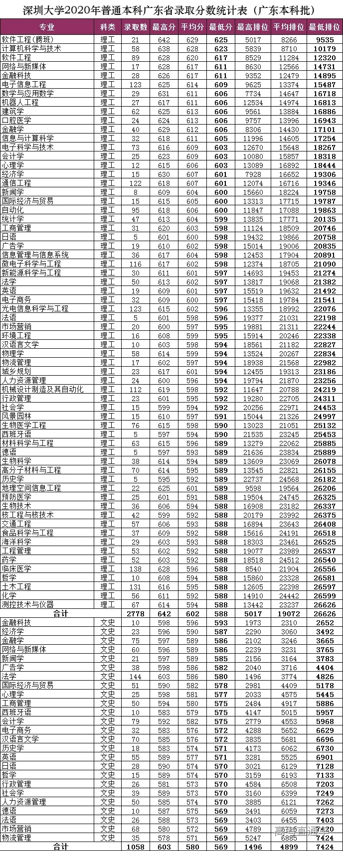 录取最低分588分,最低排位26626位,平均排位19072位,平均排位约位于全省前4.8%。理工招生专业中33个专业录取平均分达到600分或以上,约占理工专业数的52%。
