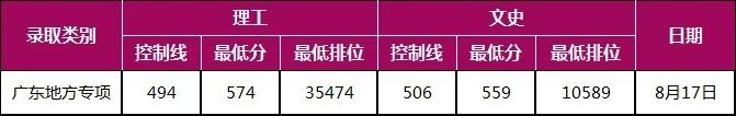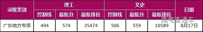 我校广东省重点院校招收贫困地区农村学生专项计划(简称地方专项计划)录取线位居广东省前列,文史类录取分数线为559分,超专项控制线53分,超高分考生优先投档线23分;理工类一志愿录取分数线为574分,超专项控制线80分,超高分考生优先投档线50分。