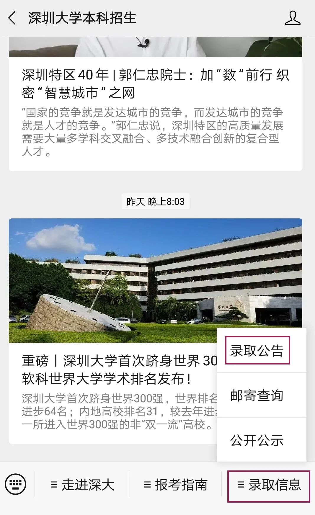 查询方式2:进入本公众号菜单“录取信息”,点击“录取公告”,可进入查询录取情况。