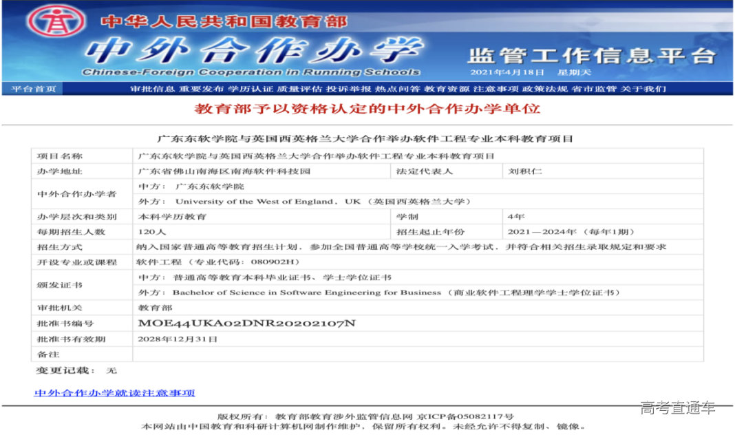 >> 中华人民共和国教育部中外合作办学监管工作信息平台可查: http://www.crs.jsj.edu.cn/