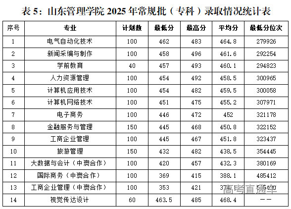 山东省常规批专科录取分数、录取位次继续保持较好态势,共投放计划1400人,其中9个普通类专业最低录取分数超过一段线。具体录取情况见表5: