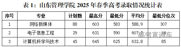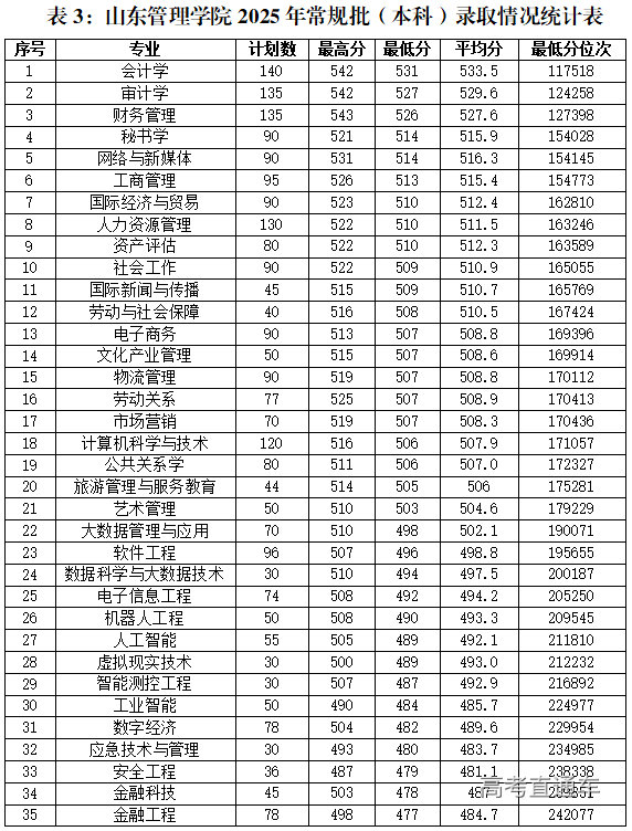 2025年,我校山东省内普通类本科招生专业共计35个,新增本科专业6个,其余的29个专业中有26个平均分比去年有提高,13个专业的最低分位次较2024年有明显提升,生源质量进一步提高。春季高考本科、艺术类本科录取分数和录取位次持续稳步上升。具体录取情况详见下表1-3。