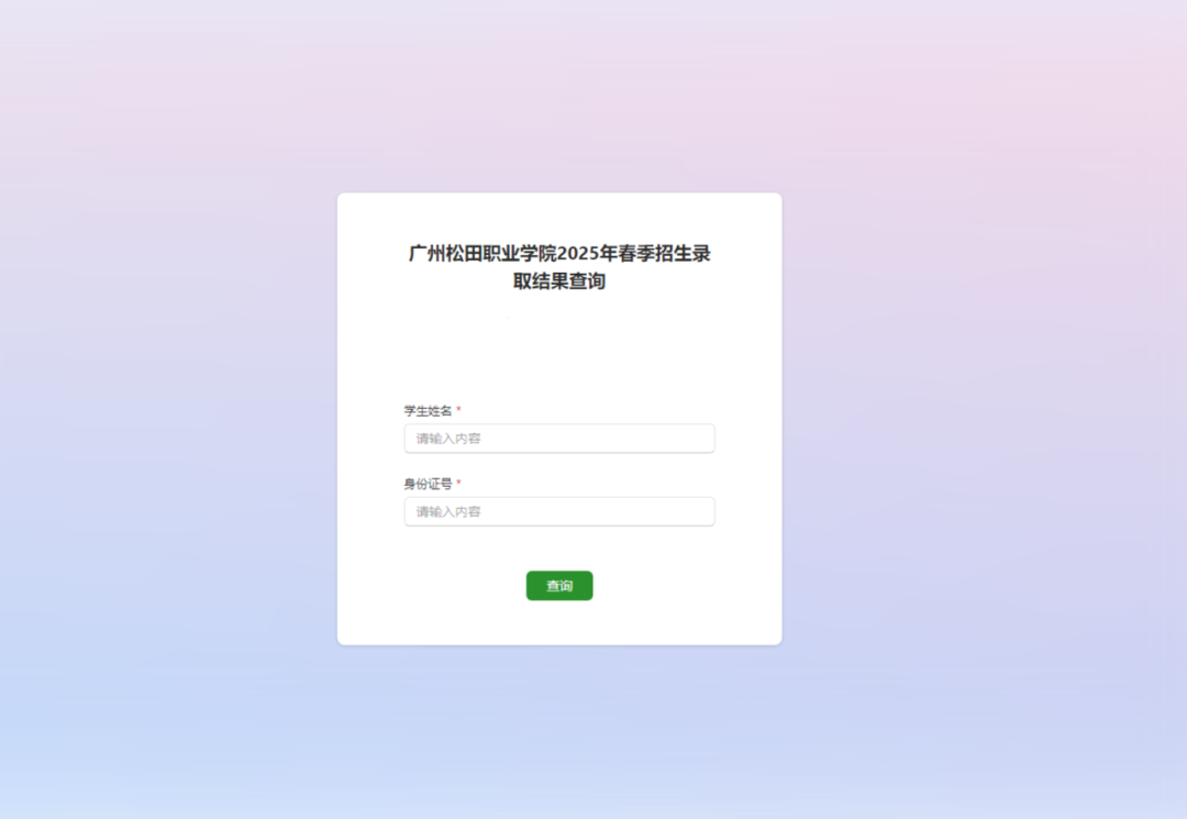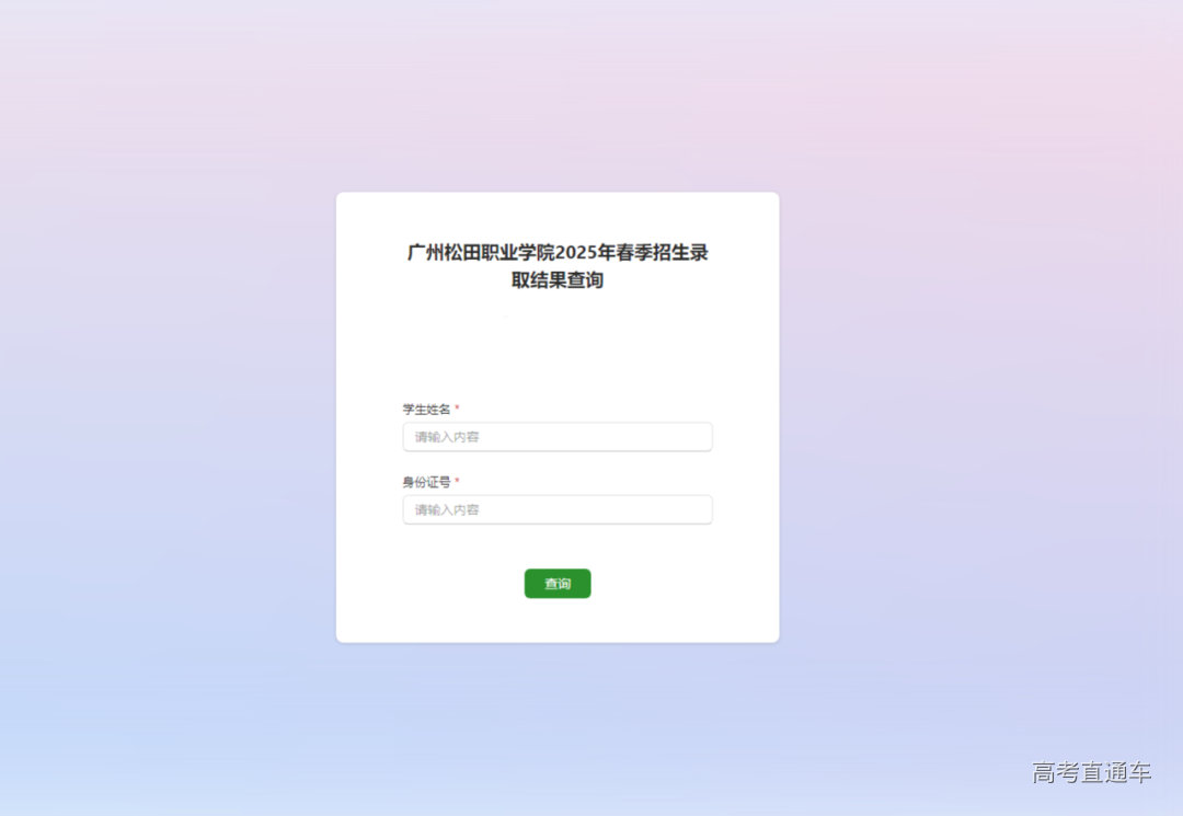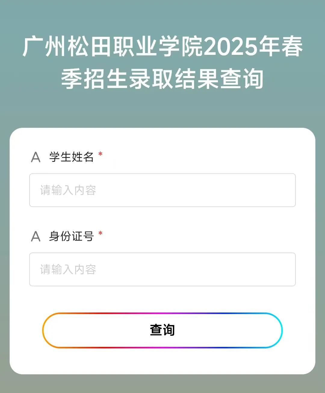 ①搜索关注“广州松田职业学院微信公众号” ②点击菜单栏“招生录取”-“录取查询” ③进入录取查询页面输入姓名、身份证号即可查询录取情况 ①登录广州松田职业学院官网:https://www.gzst.edu.cn/,下拉页面至功能查询,点击“2025年录取查询” ②进入查询页面输入姓名、身份证号即可查询录取情况