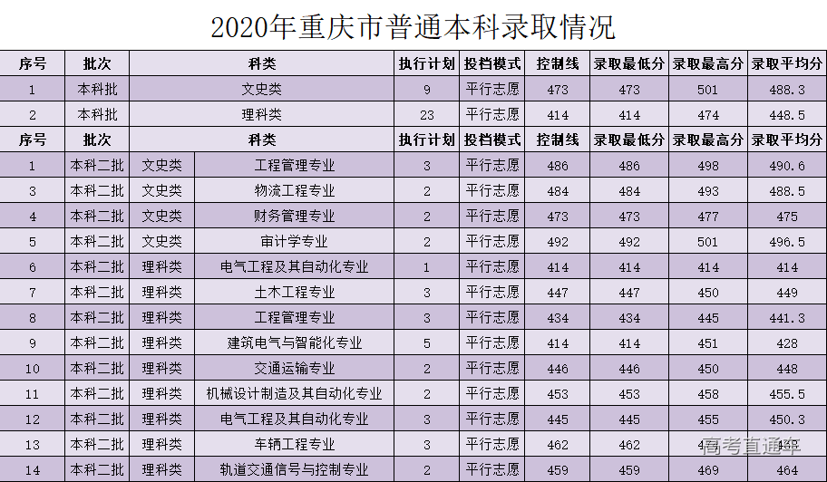 2020年西南交通大学希望学院在重庆分专业录取分数线