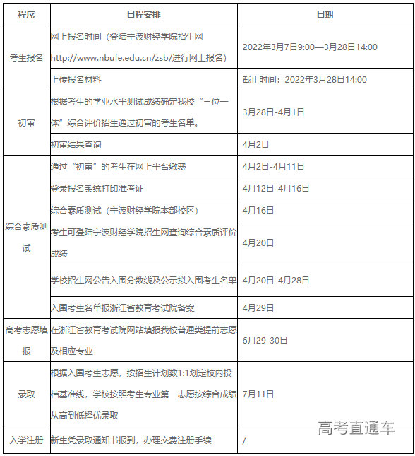 2.报名流程:申请人进入宁波财经学院招生网,登录“2022年‘三位一体’综合评价招生报名系统”,完成报名手续,确认无误后通过报名系统自动生成《宁波财经学院2022年“三位一体”综合评价招生报名申请表》,直接A4纸打印。报名无需邮寄纸质材料,将报名材料以扫描件或照片形式上传,上传截止时间为2022年3月28日14:00。