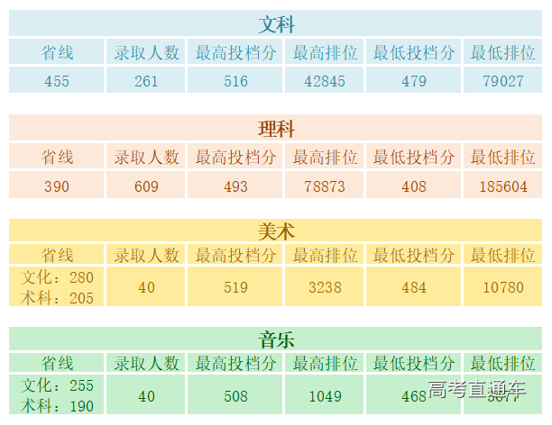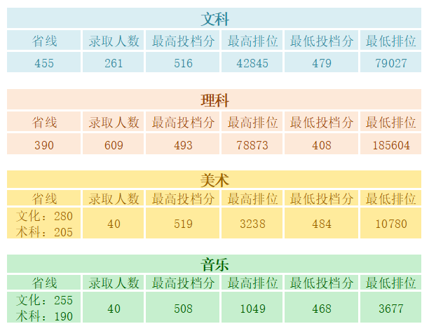 2019年我校文科投档最高分为516分,最高排位为42845;投档最低分为479分,最低排位为79027;