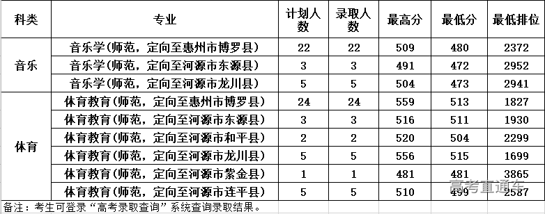惠州学院2020年广东提前批本科教师专项音乐、体育类录取成绩