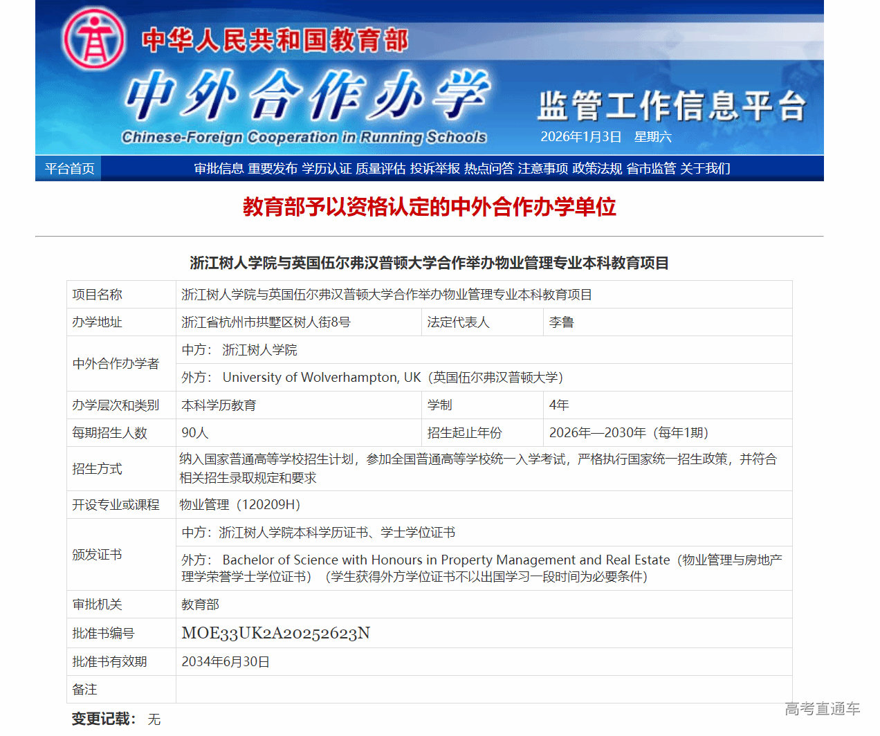 在辞旧迎新之际,教育部中外合作办学监管工作信息平台正式发布2025年下半年批复结果,为我校送来一份厚重的“新年贺礼”。浙江树人学院与英国伍尔弗汉普顿大学合作举办的物业管理专业本科教育项目(4+0,双学位)成功获批,标志着学校建校40余年来在中外合作办学本科领域实现了历史性“零的突破”,开启了国际化办学的新篇章。该项目采用“4+0”双学位培养模式,学生全程在校学习,即可同时获得中英两校的学士学位,深度融合双方优质课程体系与师资力量,致力于培养精通现代物业管理、具备卓越国际视野与实操能力的高层次专业人才。