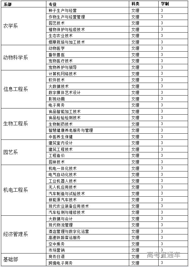 注:具体招生专业及计划以省教育厅批复为准。所有专业学费均为6000元/年。其中,农学系6个专业,在第二学年和第三学年设立校内奖助学金(高本贯通专业除外),每学年最高可获6000元,两年累计最高可获12000元。