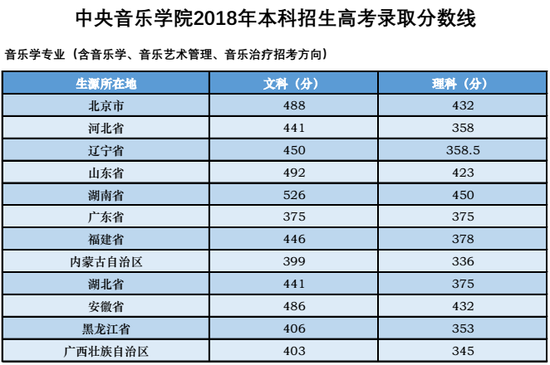 2018年中央音乐学院各省市各批次录取分数线(更新中)