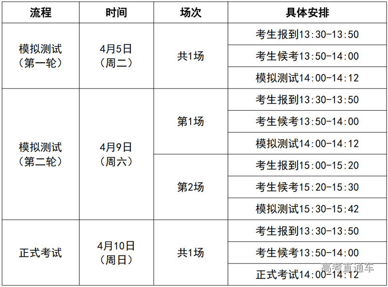 3.4月5日和4月9日,学校将组织两轮模拟测试。第一轮模拟测试安排一场,第二轮模拟测试安排两场。考生本人须至少参加一次模拟测试,熟悉考试全流程,未参加模拟测试者,后果自负。