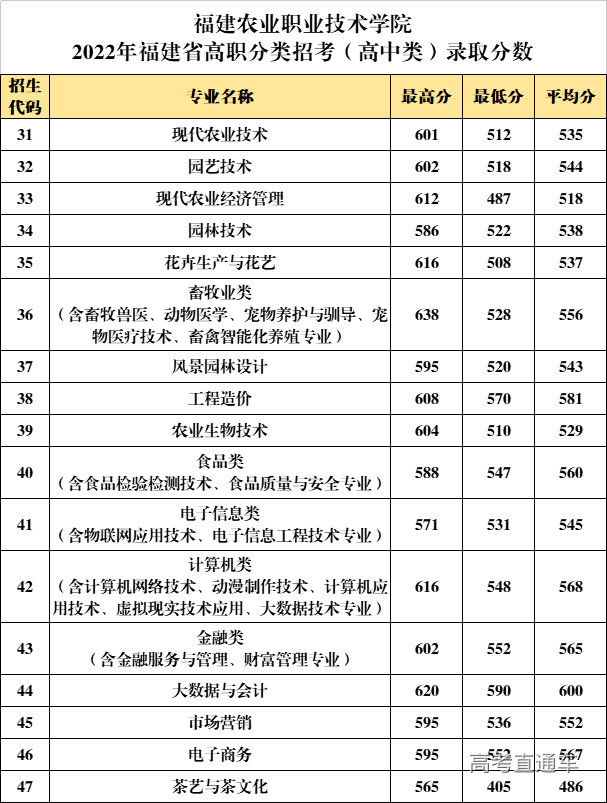 福建农业职业技术学院2022年高职分类招考(高中类)录取分数