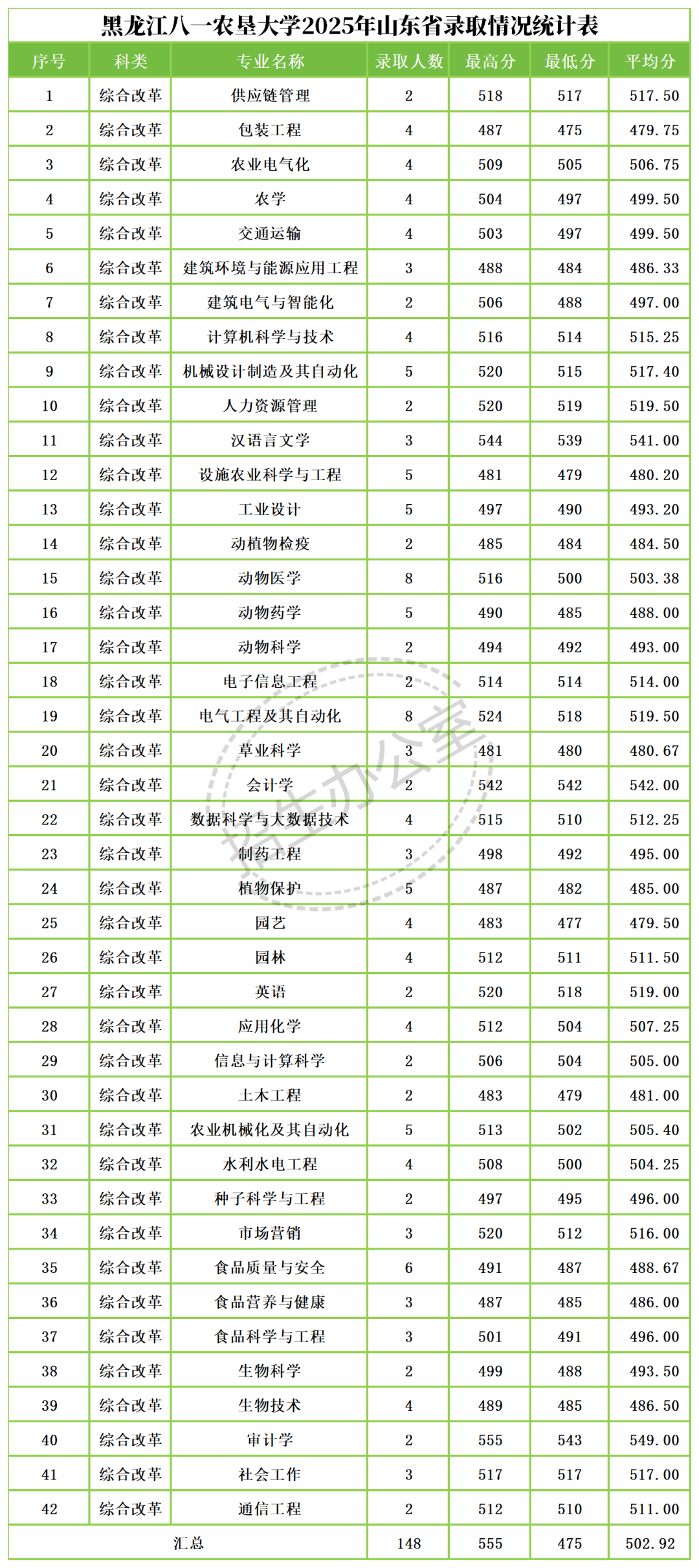 黑龙江八一农垦大学2025年山东省综合改革录取结果公布