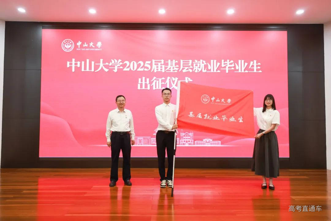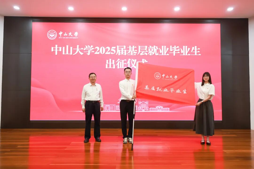 出征仪式上,高松为2025届基层就业毕业生和第27届研究生支教团授旗。高松对毕业生表示热烈祝贺,并提出三点期望:一是希望大家秉持爱国务实的精神,矢志报效国家。二是坚持理性开放的心态,积极改变世界。三是保持独立担当的姿态,努力引领未来。 近年来,中山大学不断强化和保障就业工作,引导毕业生牢固树立正确就业观,支持毕业生服务国家重大战略需求、服务国家和区域经济社会发展。近八成就业的毕业生到重点行业与关键领域工作,超八成就业的毕业生服务于“一带一路”建设、粤港澳大湾区等国家发展战略区域。 学校传承红色基因,坚持为党育人、为国育才,鼓励毕业生“永远跟党走,到祖国需要的地方去”,奔赴西部基层干事创业,基层就业人数逐年提升。近三年,学校共输送近3000名毕业生赴西部、部队和各基层单位就业,以实际行动诠释中大人的家国情怀和使命担当。