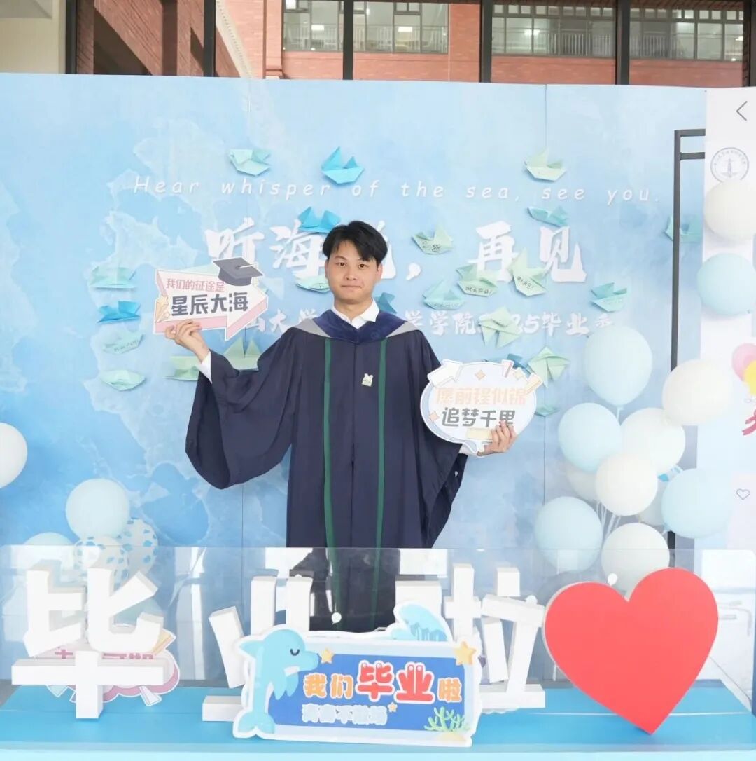冯孟佳 海洋科学学院硕士毕业生 毕业去向: 自然资源部南海局 党的十八大以来,海洋强国战略的深入推进和“一带一路”倡议的实施,为海洋事业发展提供了广阔舞台。国家海洋资源开发、生态保护与权益维护离不开扎实的科研支撑,而自然资源部南海局正是践行国家海洋战略的重要单位,能够在这里投身海洋方面的工作,既是对我专业能力的认可,更是将个人理想融入国家需求的宝贵机会。在岗位上,我会以饱满的热情和严谨的态度投入工作,脚踏实地、勇于创新,以实际行动服务海洋强国建设,守护好祖国的“蓝色国土”,为海洋可持续发展与国家海洋权益维护贡献青春力量!
