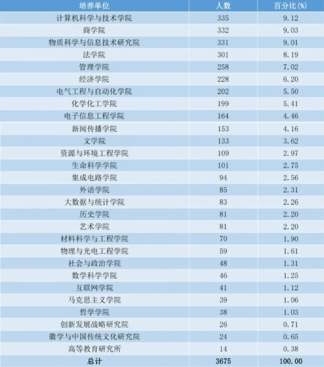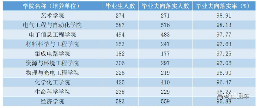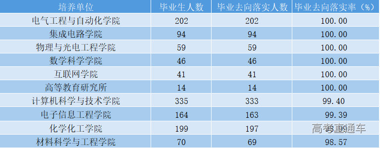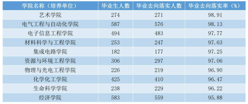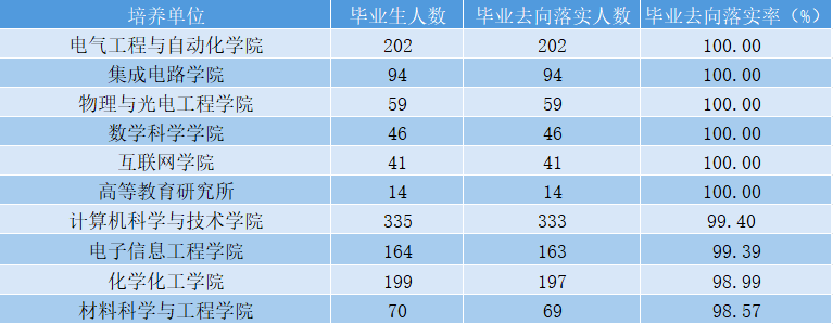 2023 届研究生毕业生中“电气工程与自动化学院”“集成电路学院”“物理与光电工程学院”“数学科学学院”“互联网学院”和“高等教育研究所”毕业生的毕业去向落实率最高,均达到100.00%。