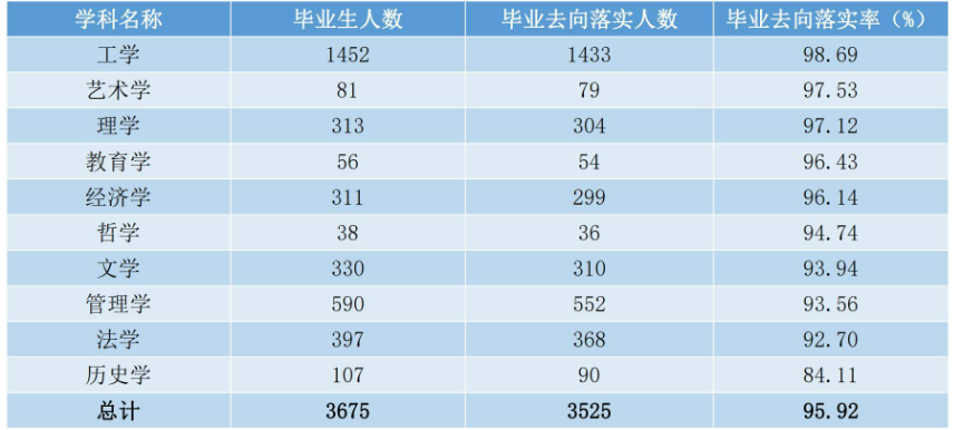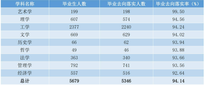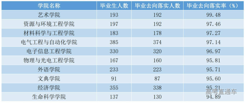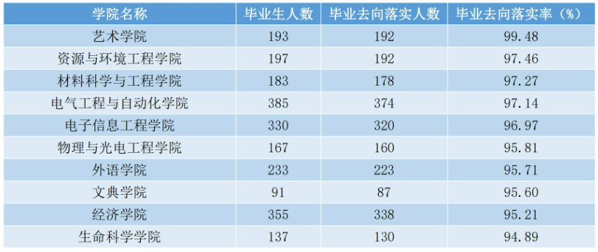 2023 届本科毕业生中“艺术学院”毕业生的毕业去向落实率最高,为 99.48%,其次是“资源与环境工程学院”(97.46%)和“材料科学与工程学院”(97.27%)。
