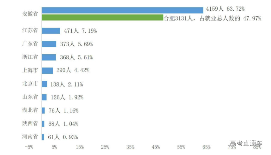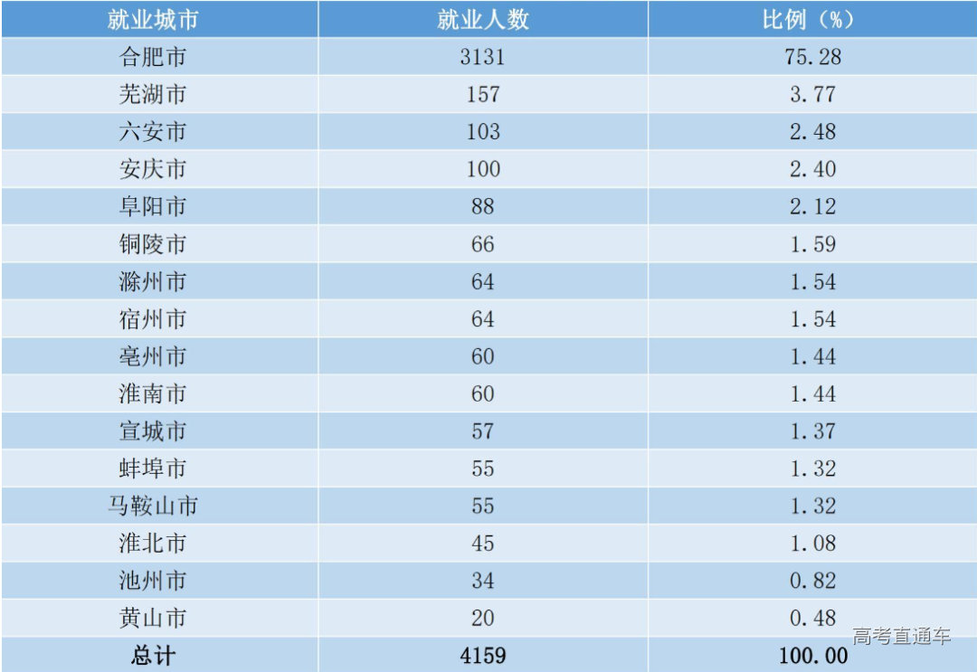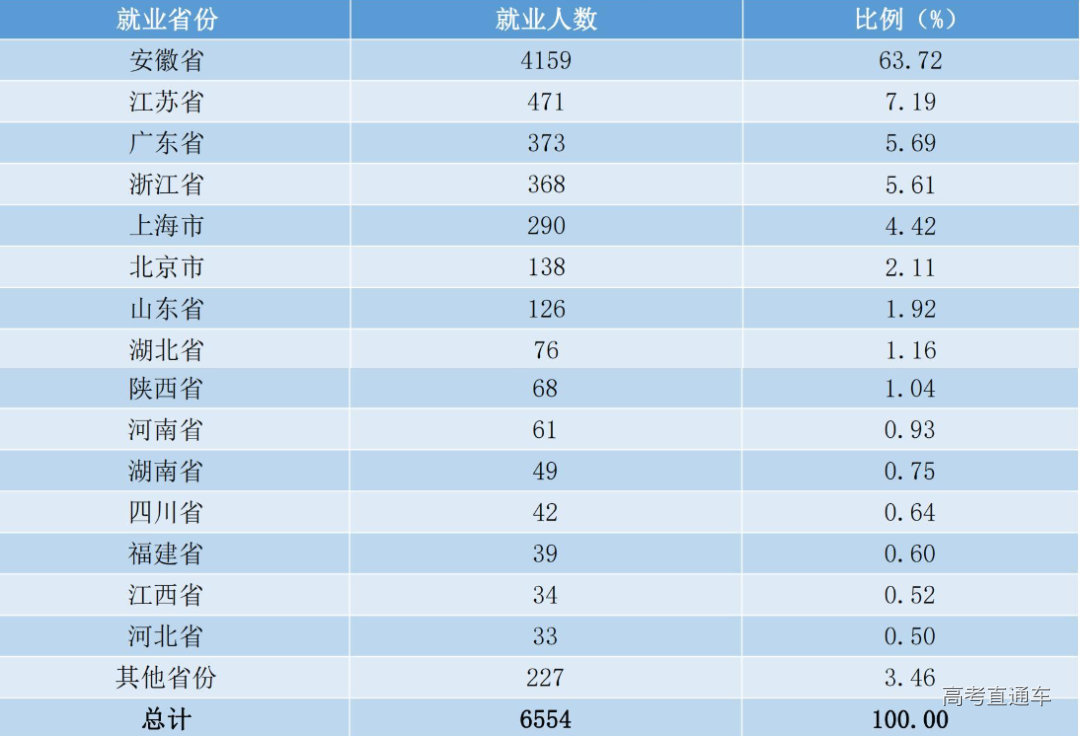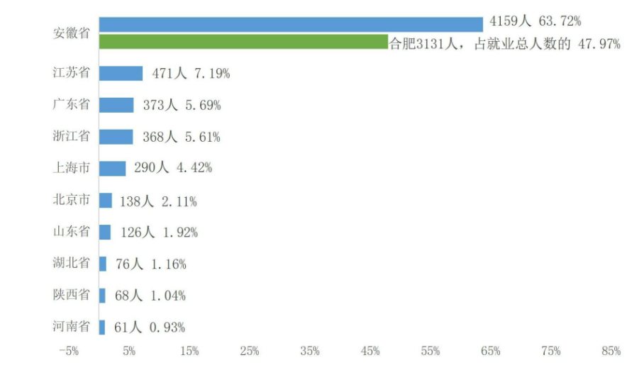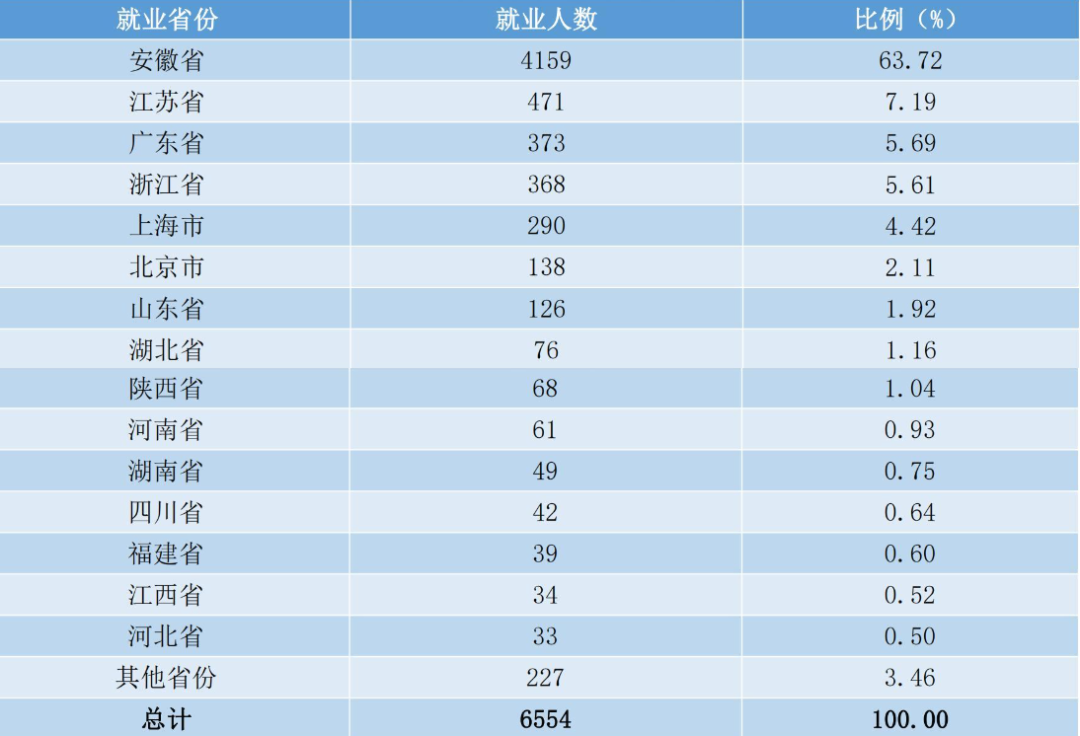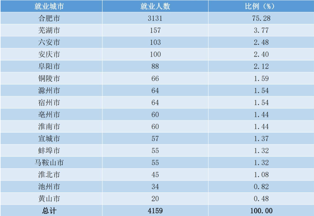从安徽区域看,选择在合肥市就业的人数最多,人数为3131人,占安徽省就业人数75.28%,占就业总人数的47.97%。