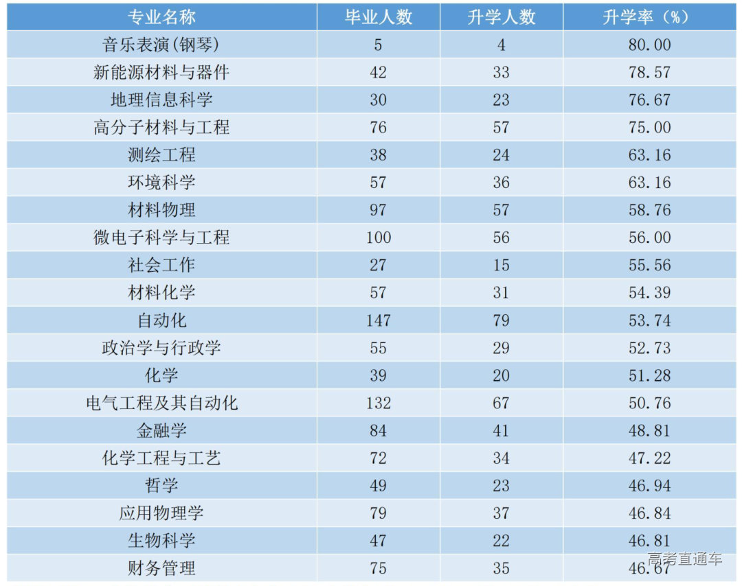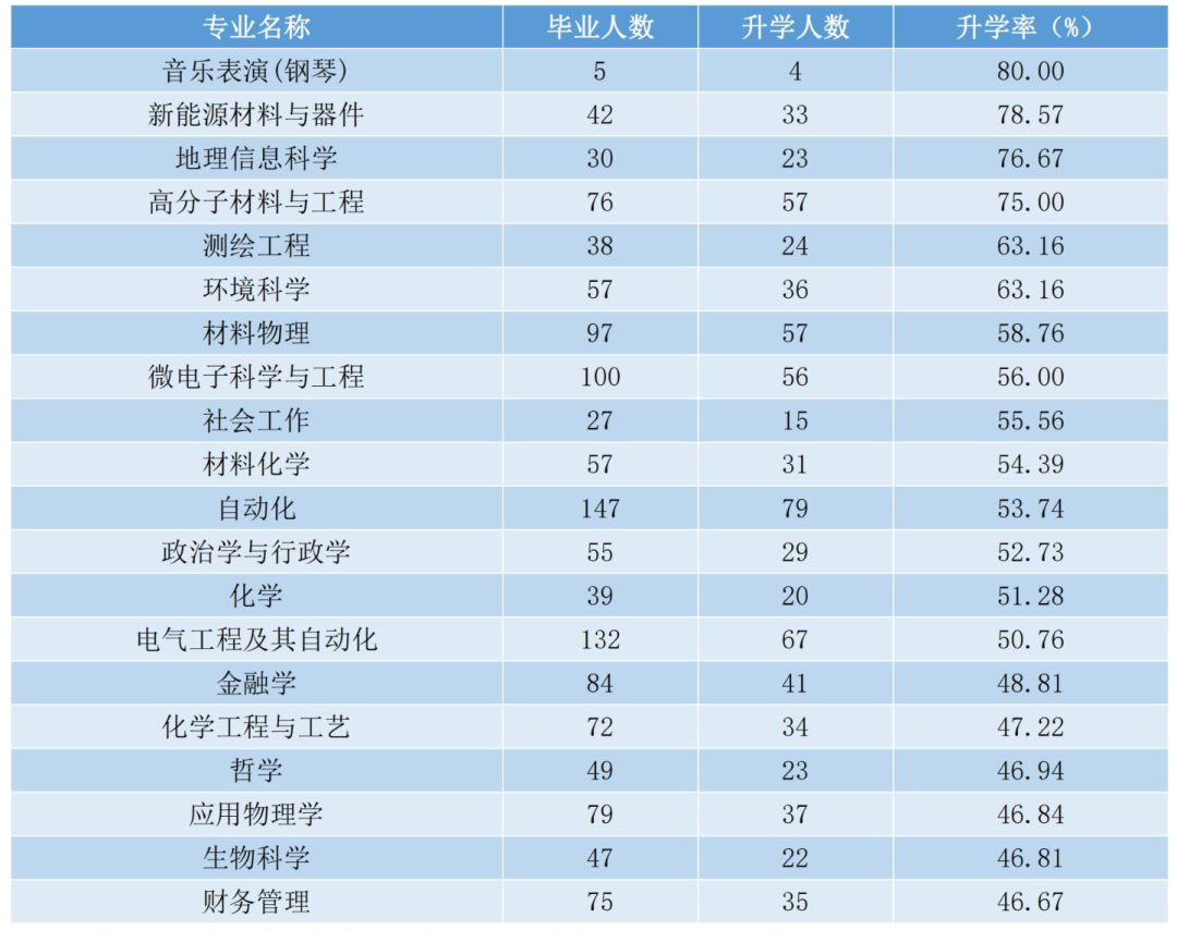 对比 2023 届各专业本科毕业生升学率,“音乐表演(钢琴)”的升学率最高,为80.00%,其次是“新能源材料与器件”(78.57%)“地理信息科学”(76.67%)“高分子材料与工程”(75.00%)。