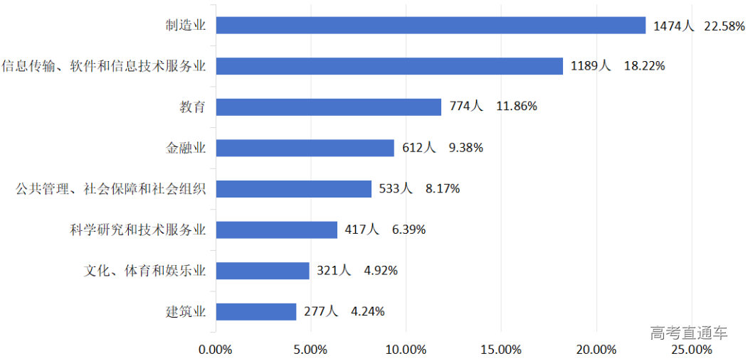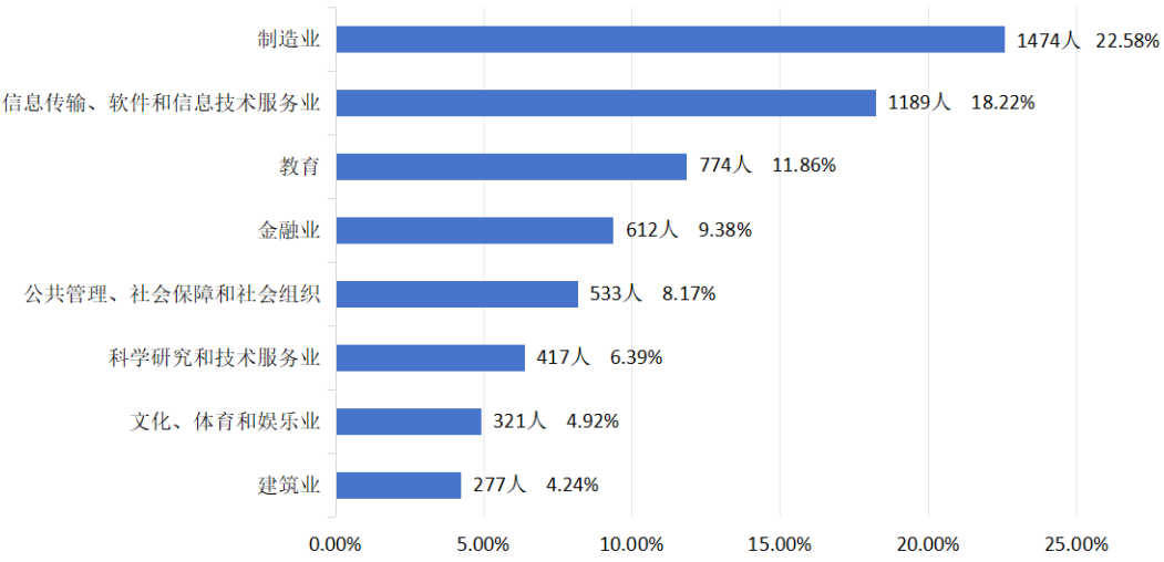 2023届毕业生就业主要集中在“制造业”(22.58%),其次是“信息传输、软件和信息技术服务业”(18.22%),详见下图。