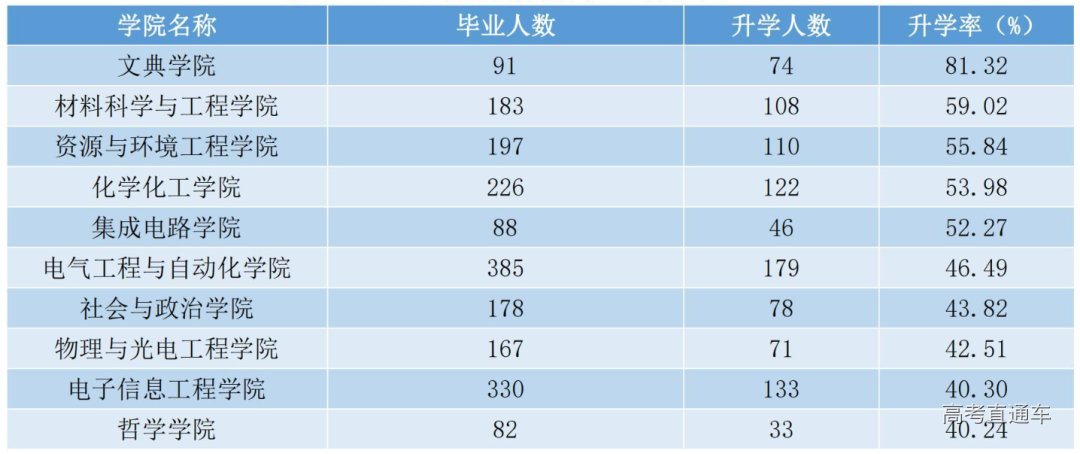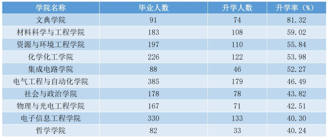 “文典学院”的2023届本科毕业生升学比例最高,有81.32%的毕业生成功升学,其次是“材料科学与工程学院”(59.02%)“资源与环境工程学院“(55.84%)“化学化工学院”(53.98%)和“集成电路学院”(52.27%)。
