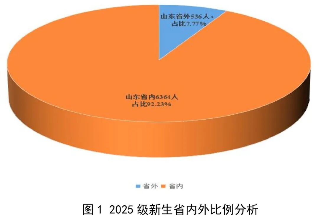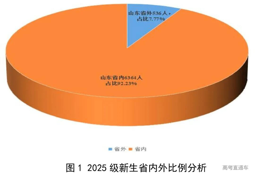 省内外及男女生比例 2025年录取新生山东省6364名,占比92.23%,省外536名,占比 7.77%。 新生中男女性别比约为60.06%,39.94%;其中,男生4145名,女生 2755名。