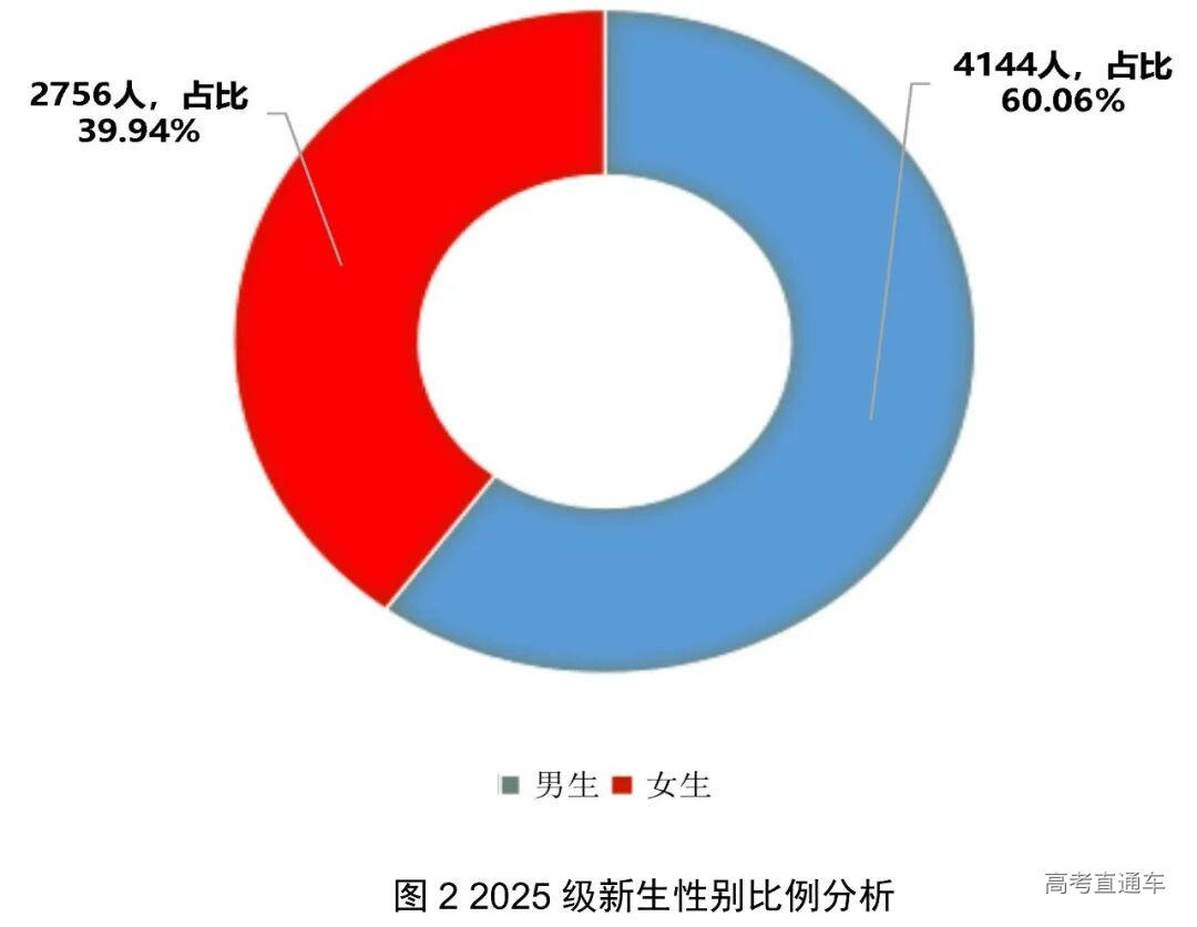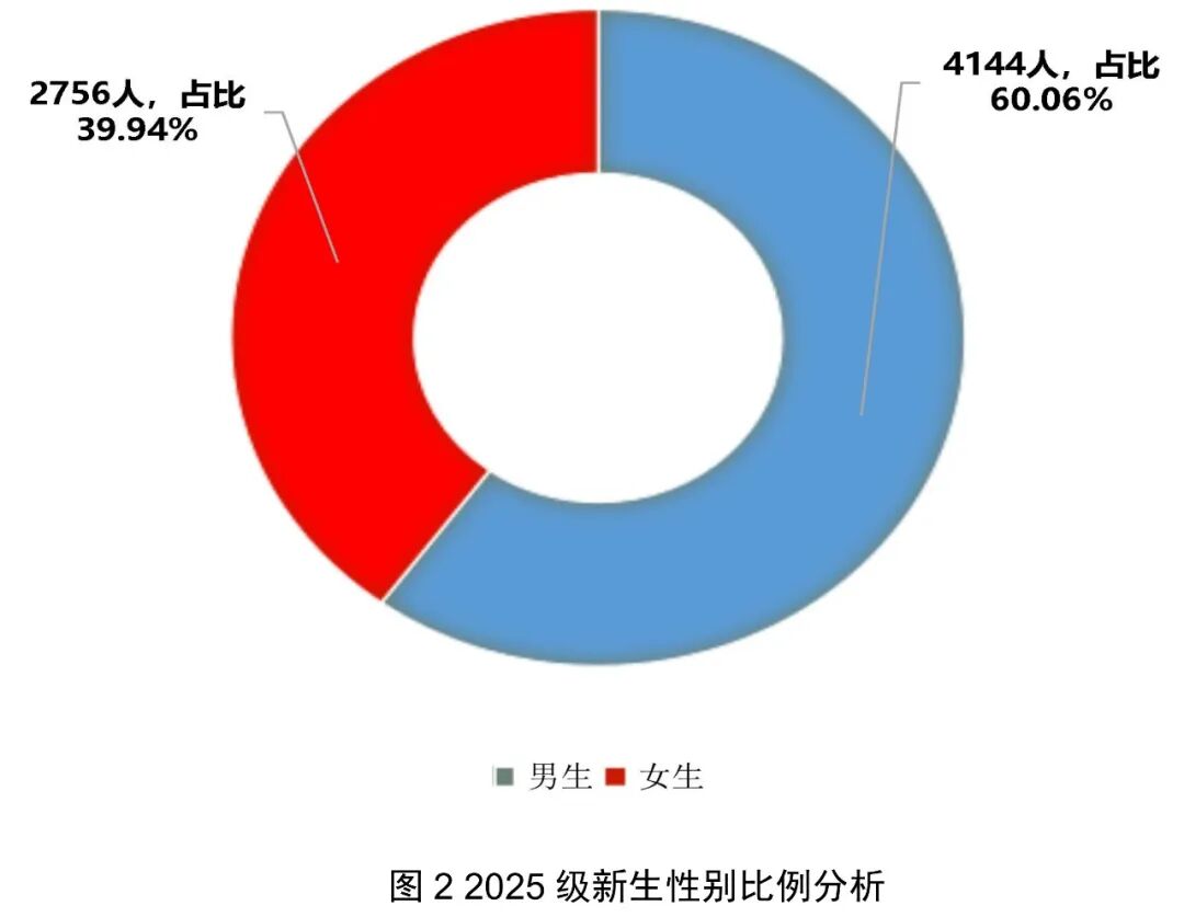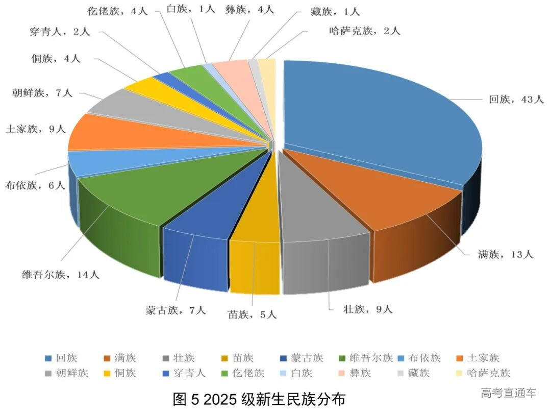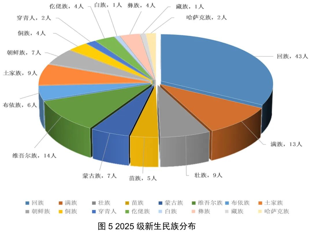 省内外及男女生比例 在2025级新生中,汉族有6769人;除汉族外,还有来自16个少数民族的131名新生,占到录取新生总数的1.9%。人数较多的少数民族依次为:回族、维吾尔族、满族、壮族、土家族、蒙古族、朝鲜族、布依族、苗族。
