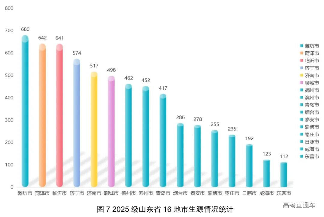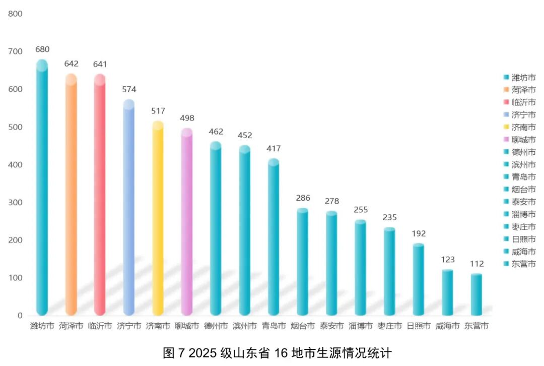 在山东省内16个地市的录取的6364名新生中,录取新生数超过300的有9个地市,分别为潍坊市、菏泽市、临沂市、济宁市、济南市、聊城市、德州市、滨州市、青岛市。16地市生源情况如图 所示。