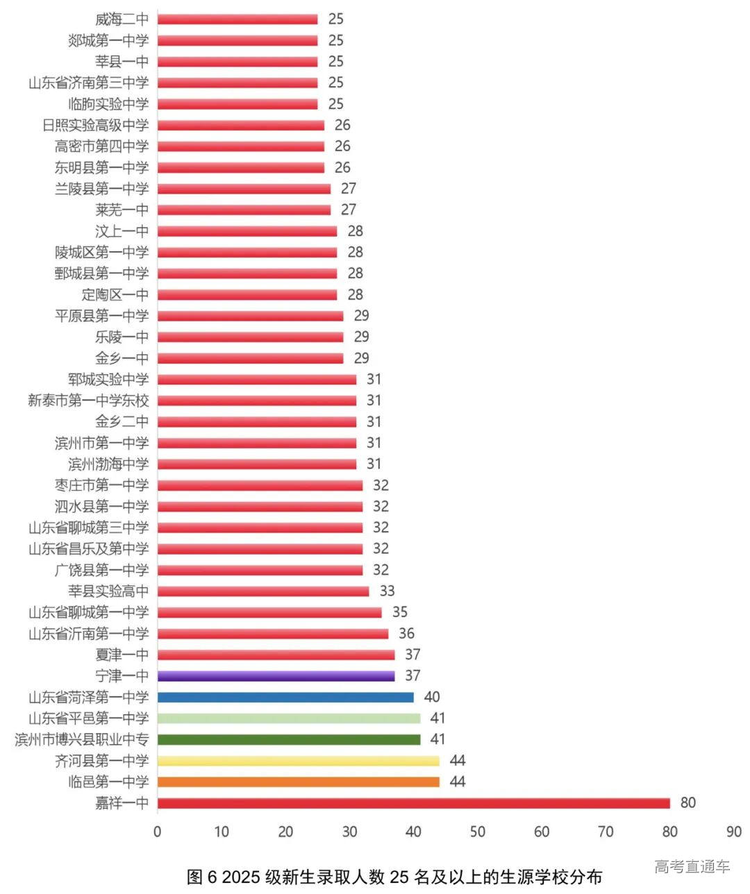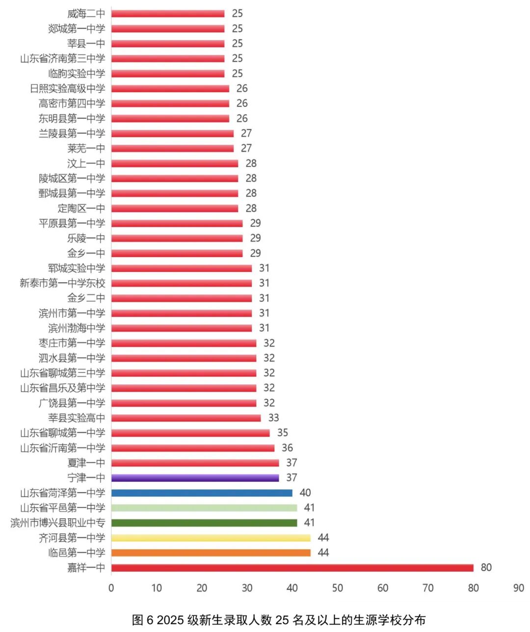 主要生源学校 2025级新生来源学校涉及1178所,录取人数5名及以上的生源学校有414所。其中,录取人数排名前五的学校为嘉祥一中、临邑第一中学、齐河县第一中学、滨州市博兴县职业中专、山东省平邑第一中学,录取人数分别为80名、44 名、44 名、41 名、41名。录取人数25名以上的生源学校分布如图所示。