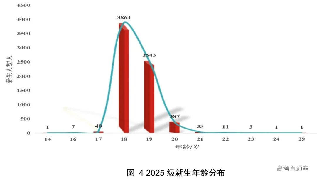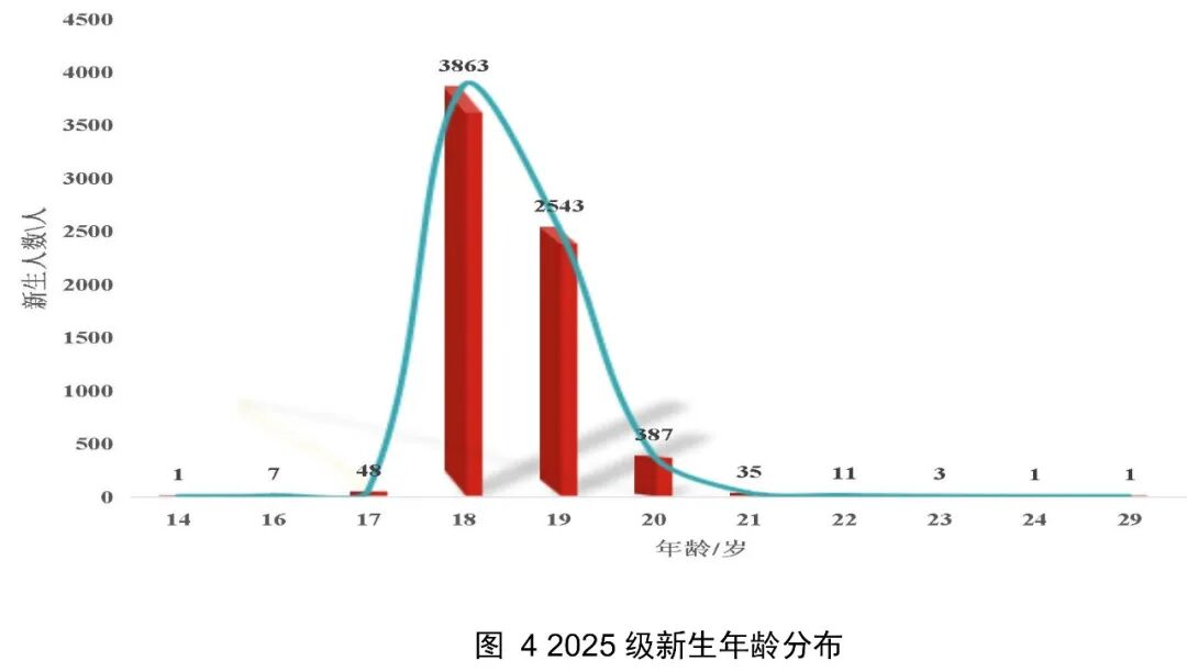 录取新生年龄分布 在2025年录取的新生中,年龄最小的14岁(2011年出生),仅有1名新生,被生物技术专业录取;年龄最大的29岁(1996年出生),仅有1名,被市场营销专科专业录取。录取新生年龄18岁(2007 年出生)的人数最多,共有3863名;年龄为19岁(2006 年出生)的人数次之,共有2543名。新生年龄绝大部分集中在17岁至21岁。