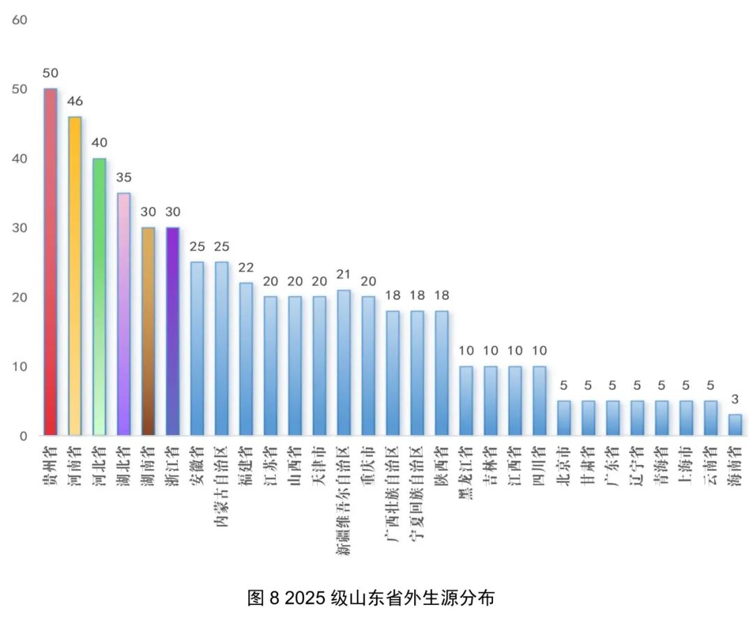 山东省外生源情况 我校2025年山东省外共录取536名新生,占录取新生总数的7.77%。录取新生数在30人(含 30 人)以上的省(自治区、直辖市)有6个,分别是:贵州省50人、河南省46人、河北省40人、湖北省35人、湖南省30人、浙江省30人。山东省外生源情况分布如图所示。 有梦不觉天涯远 扬帆远航再出发 祝愿2025级新同学 在山东航空学院 成为更好的自己