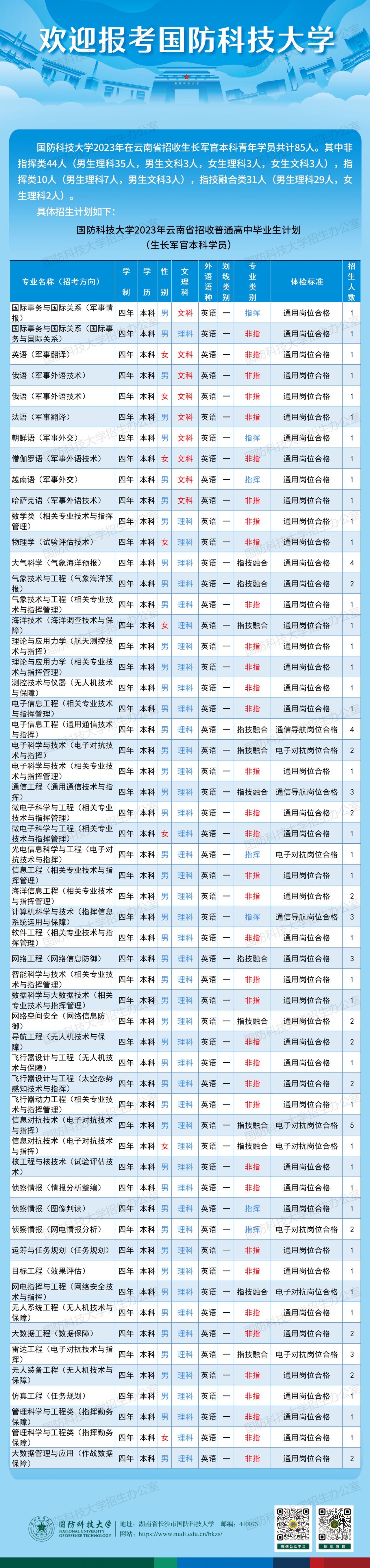 国防科技大学2023年生长军官本科学员招生计划(云南)