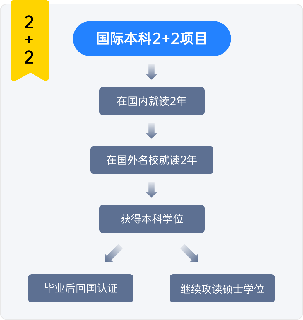 国际本科是指国内的某些高校和其它国家的合作高校联合培训,最终获得国外高校颁发的国际认可的本科学位证书。一般由国内培训和国外课程学习两个阶段组成。一般采用国内1-2年,国外2-3年,大多数是英语国家的联合培养,在国内进行英语培训及专业基础课的学习。然后去国外大学完成学业。
